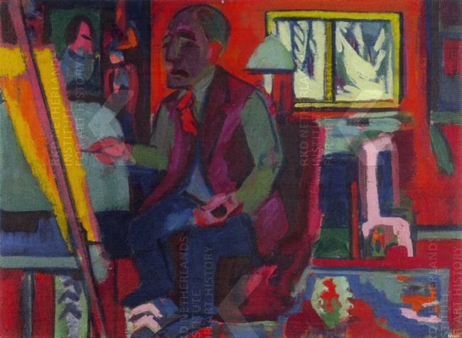 in atelier, zittend achter schildersezel met penseel in rechterhand