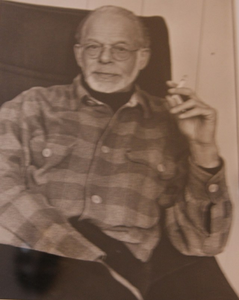 zittend in stoel, aankijkend, sigaret in linkerhand
