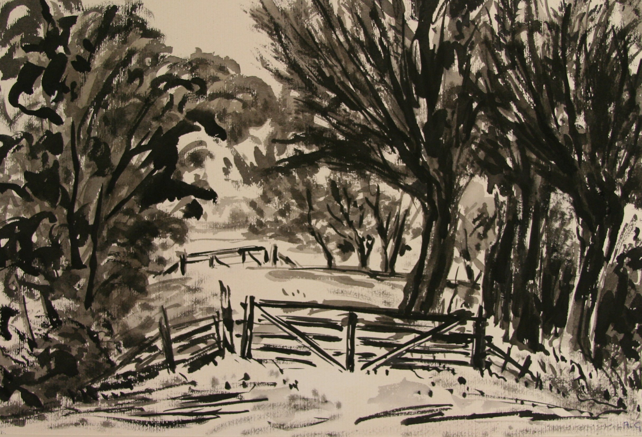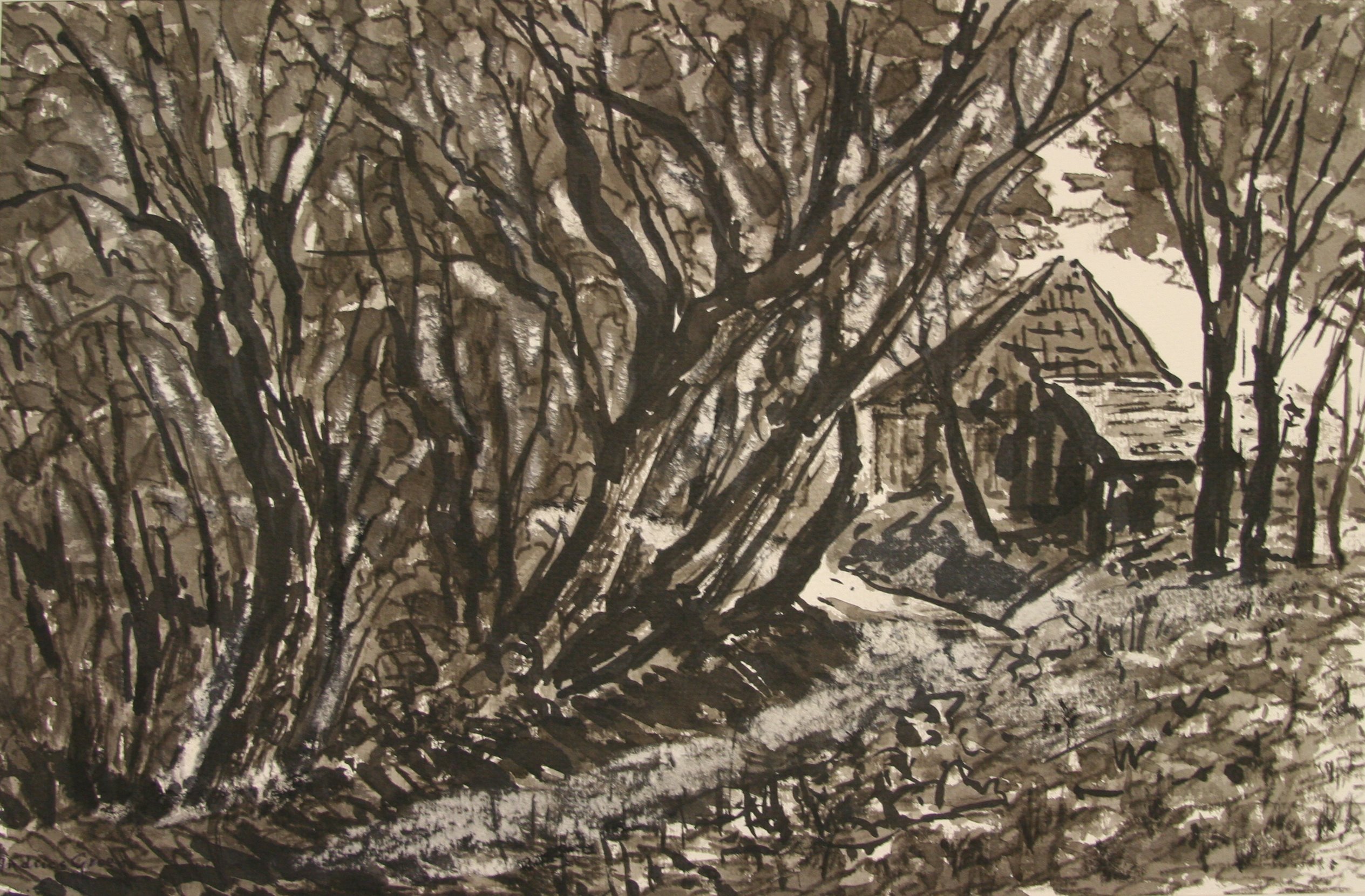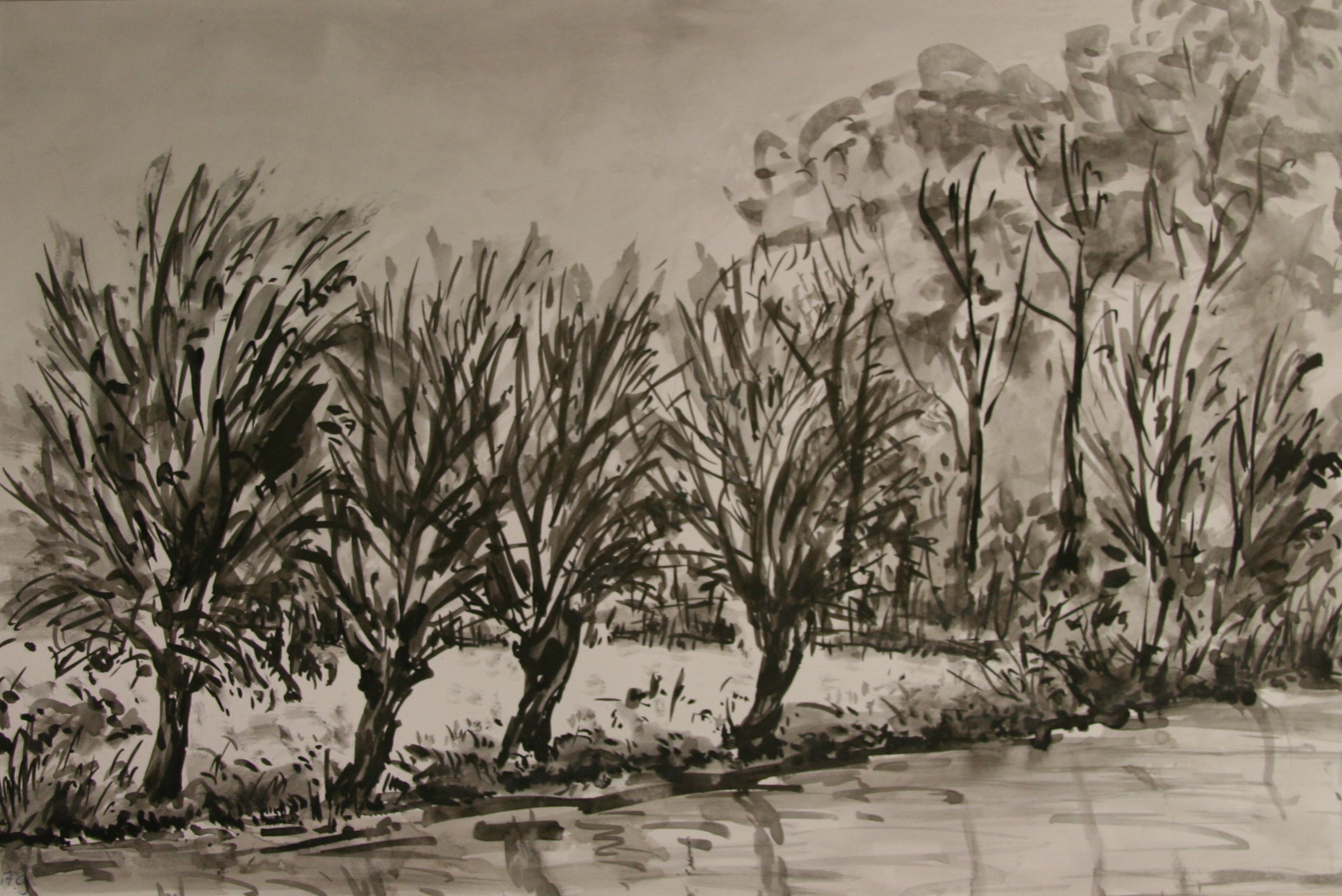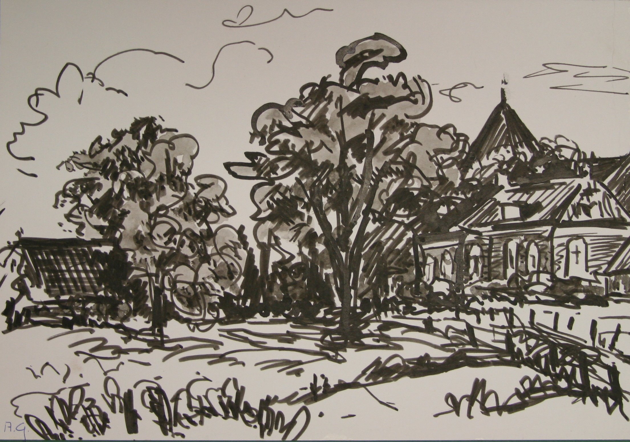 Map V k1a, provincie Groningen, 5 penseeltekeningen in zwartwit, in passe-partout.