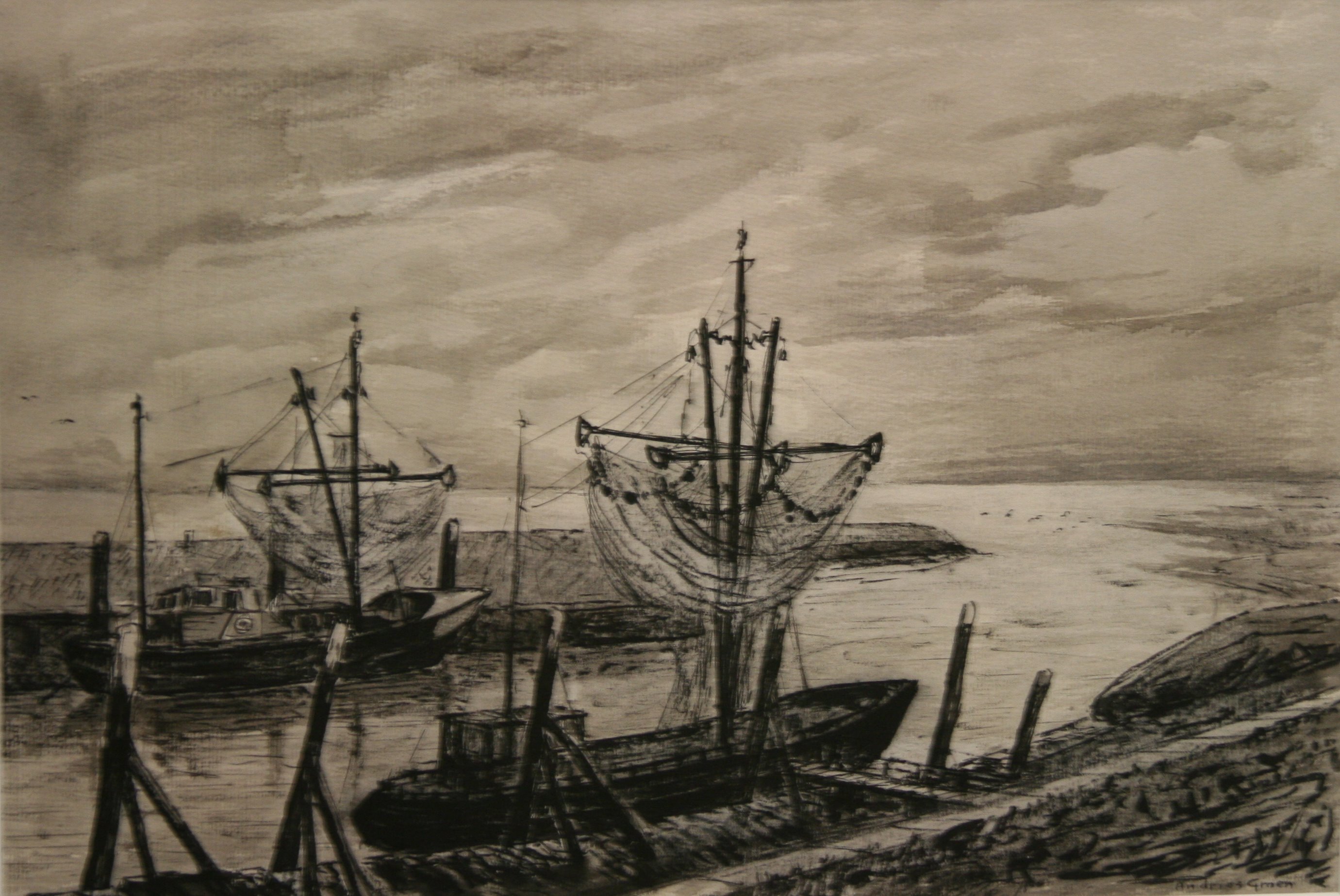 Er is enig perspectief aangebracht in de tekening. Door de dukdalven en vooral door de boten is er veel diepte ontstaan. Er zijn voornamelijk in de boten details aangebracht. De boten, dukdalven en kades zijn in tegenstelling tot de rest van de tekening met donkere tinten afgebeeld, waardoor deze sterk contrasteren met het lichtere water en lucht.