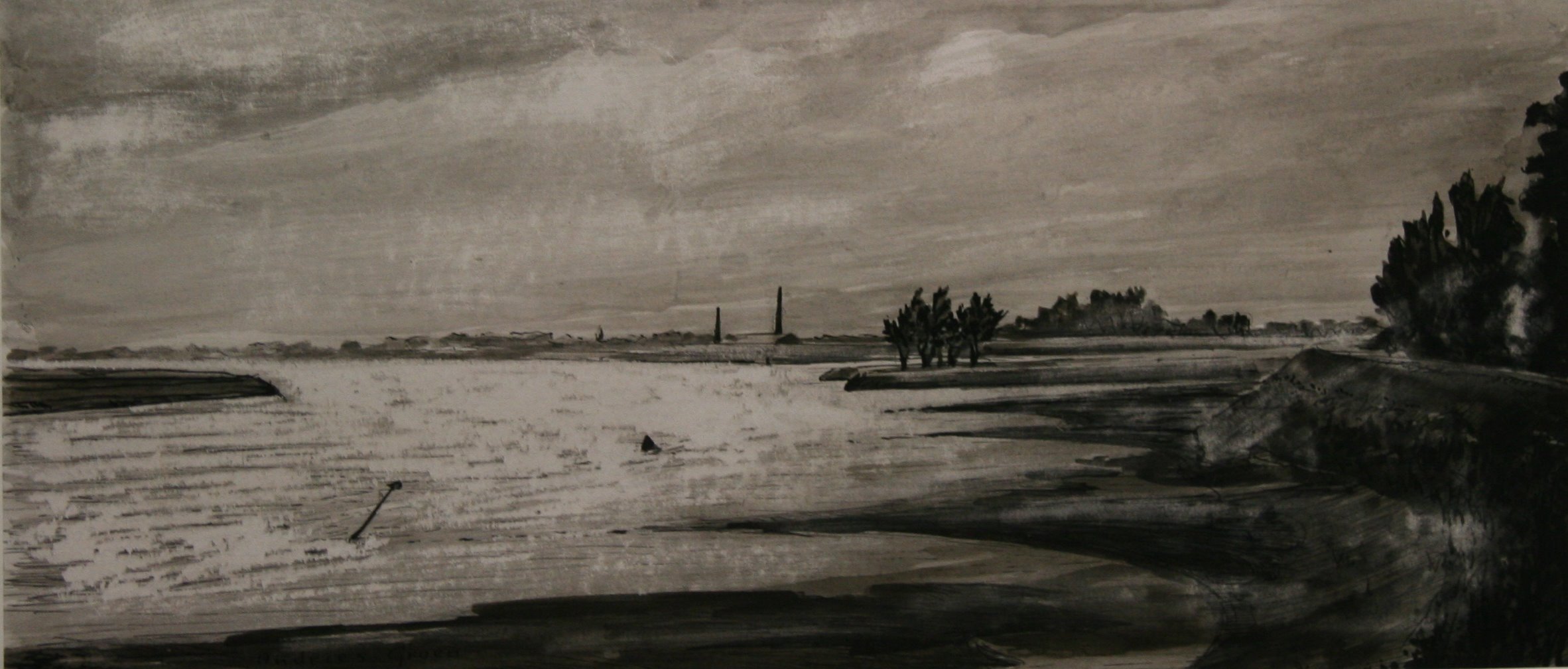De tekening heeft een duidelijk perspectief verkregen door de rivier, dijk en oevers. Er zijn weinig details aangebracht. Er is sprake van een mooi spel van licht en donker. De Waal en de lucht erboven zijn licht en contrasteren sterk met de donkere oevers, bomen en dorp.