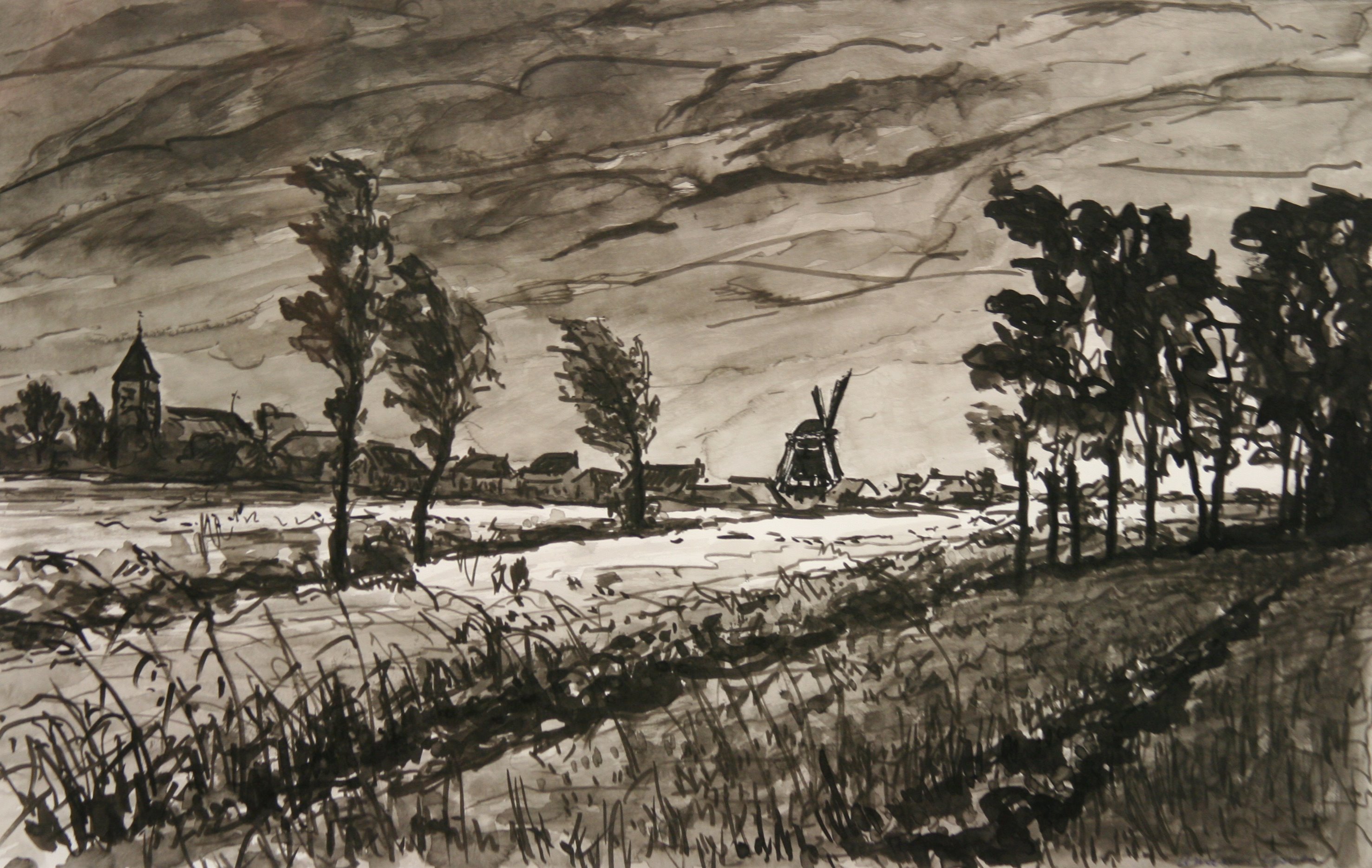 De tekening heeft door de weg en de bomen een duidelijk perspectief verkregen. Er zijn weinig details aangebracht. Het gras op de voorgrond is met simpele lijnen weergegeven. Er is sprake van een mooi spel van licht en donker. De weg, het weiland ernaast en de lucht boven de horizon zijn licht en contrasteren sterk met het donkere weiland op de voorgrond, bomen en de bebouwing.