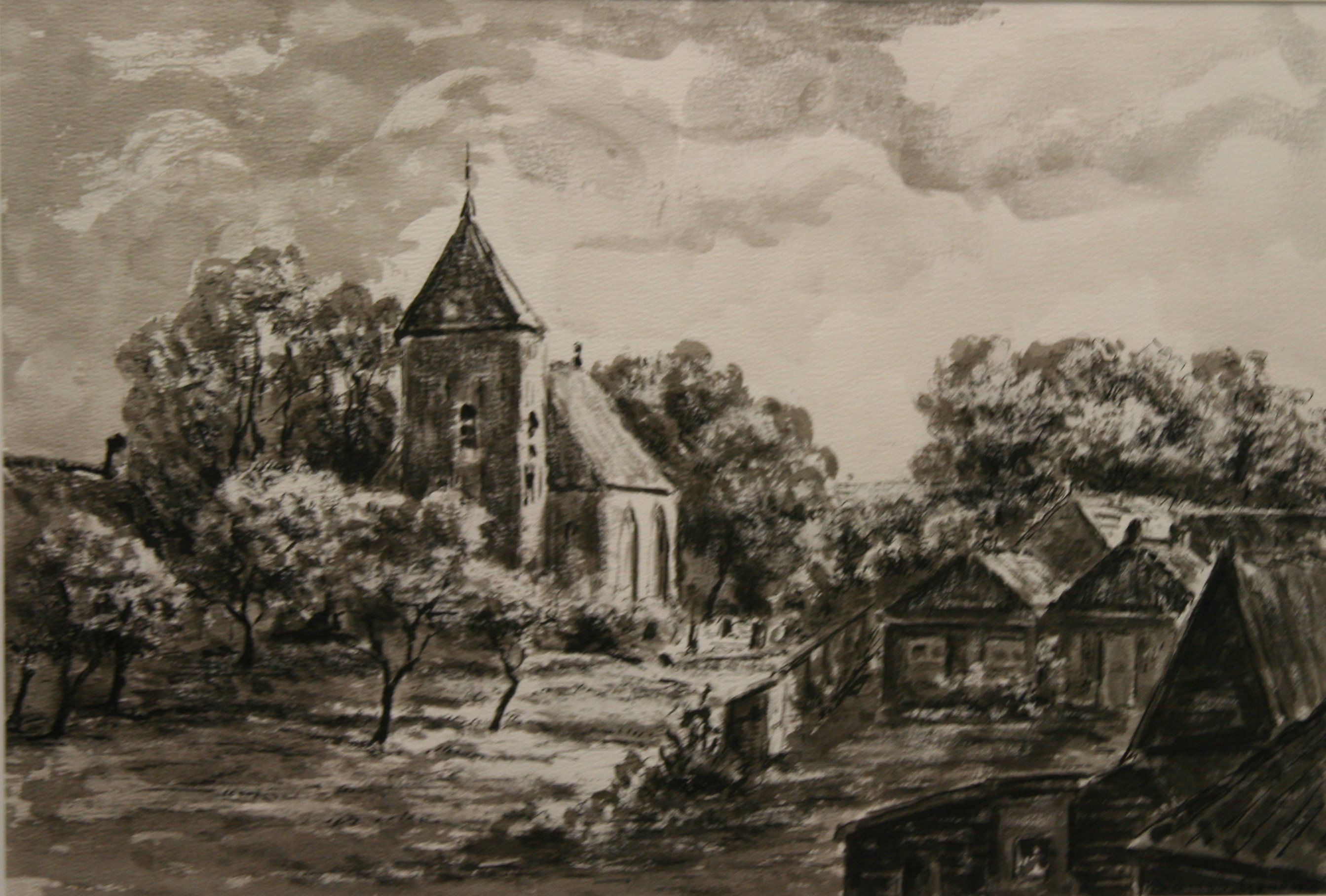 De tekening heeft door de huizen aan de rechterkant en de bomen voor de kerk enig perspectief verkregen. Het licht komt van rechts wat blijkt uit de verlichte delen van de rechterzijde van de kerk en daken. Er zijn weinig details aangebracht. Er is sprake van een mooi spel van licht en donker. De lucht en verlichte delen van de bebouwing zijn licht en contrasteren sterk met de donkere huizen en bomen.