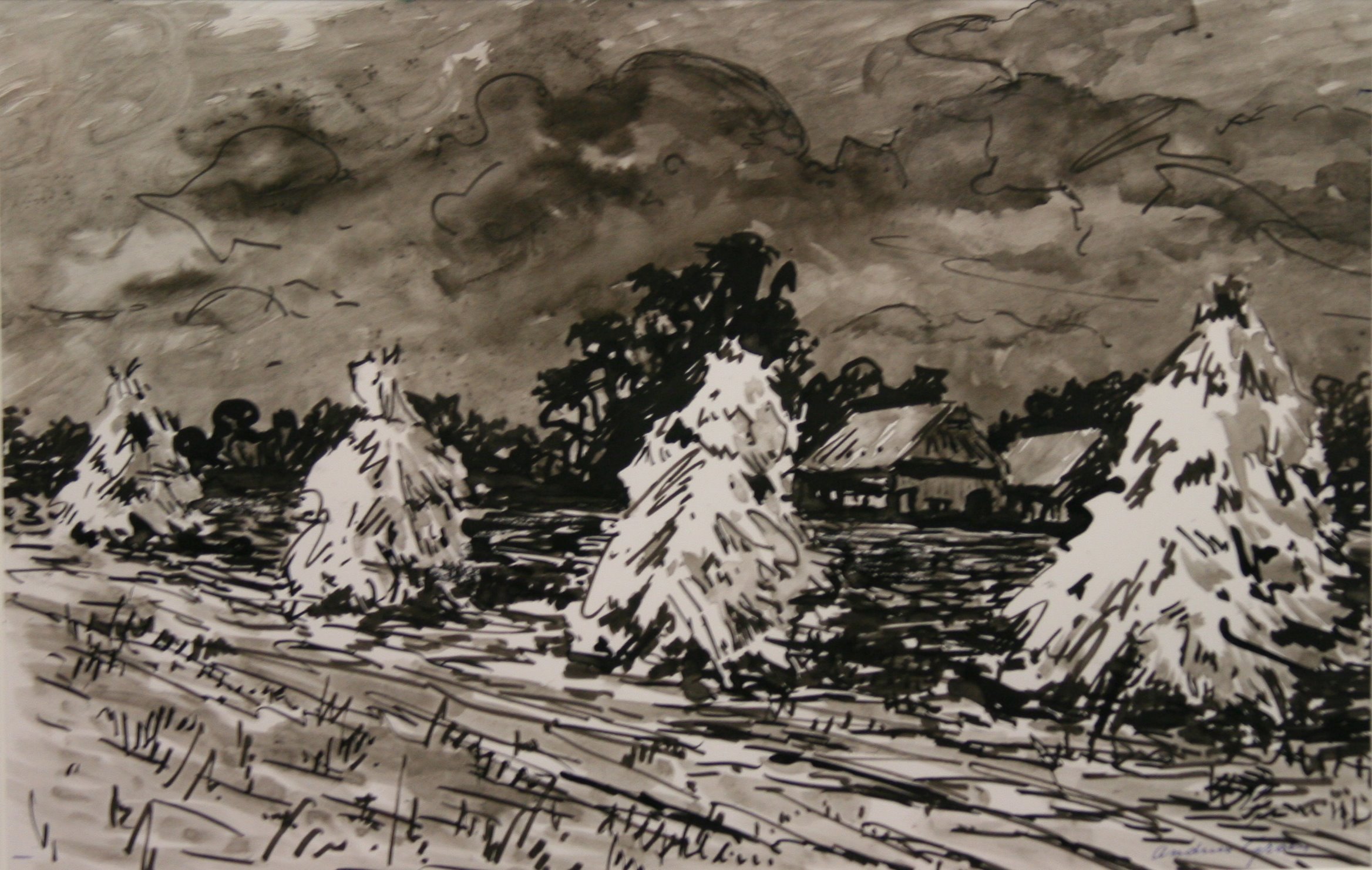 Er is door de hooimijten een duidelijk perspectief in deze tekening ontstaan. Er zijn weinig details aangebracht. Met groffe lijnen zijn de bomen, wolken en hooimijten getekend. De bomen, wolken en huizen zijn in tegenstelling tot de rest van de tekening met donkere tinten afgebeeld, waardoor deze sterk contrasteren met de lichtere hooimijten en voorgrond. Hierdoor trekken de hooimijten meteen de aandacht.