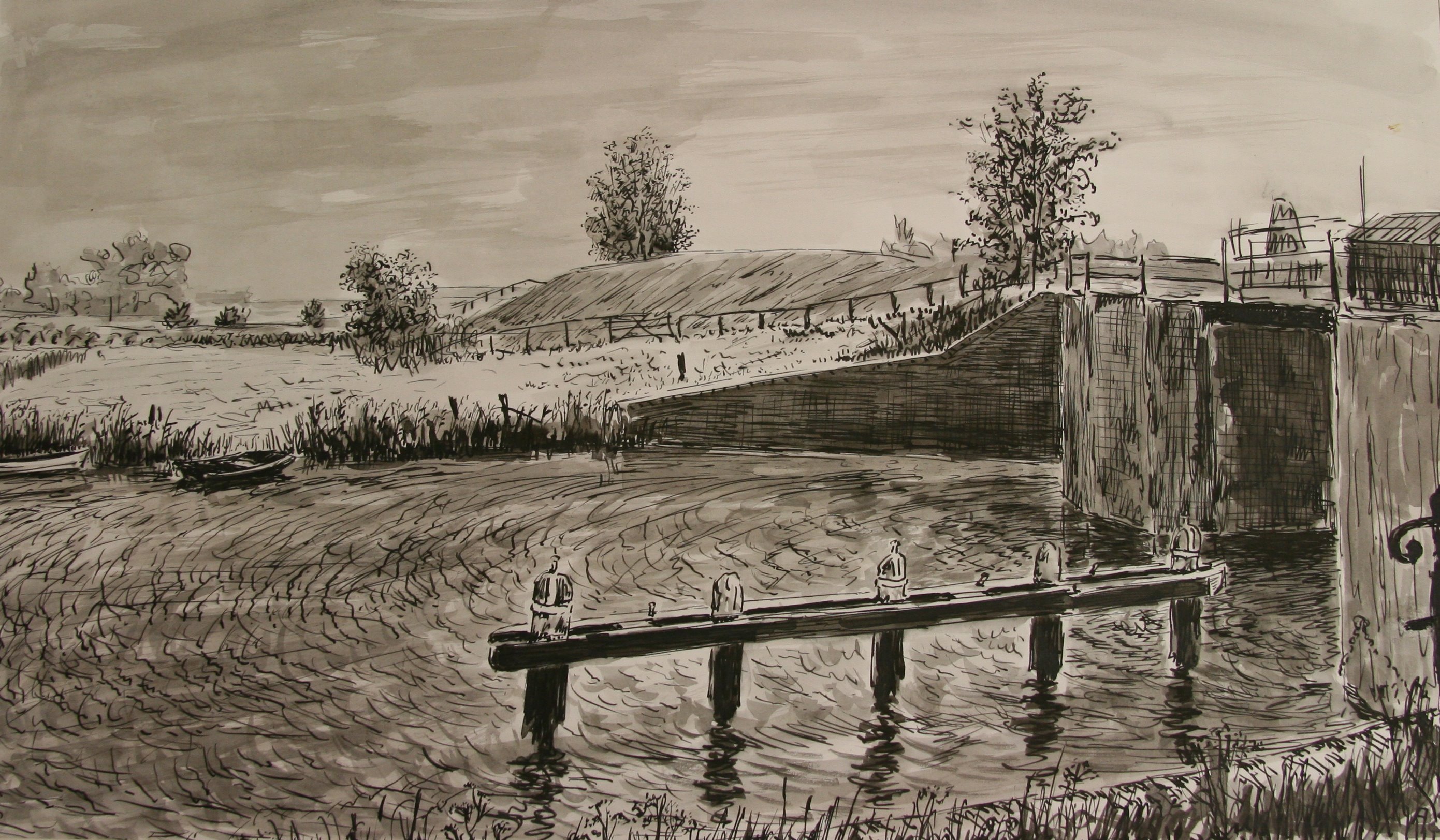 Pentekening van de spuisluis van Schouwerzijl ten noorden van de stad Groningen. Het water, dat de Kromme Raken heet, stroomt van rechts naar links. Aan deze kant van de oever is een rij dukdalven, die met elkaar verbonden zijn met balken. Aan de overkant liggen twee kleine boten. Rechts is de daadwerkelijke sluis met sluismuren. Over de sluis loopt een weg, die voorbij de sluis naar beneden loopt. Rechts van de weg is de dijk met enkele bomen. Voorbij de weilanden is in de verte een klein bos zichtbaar.