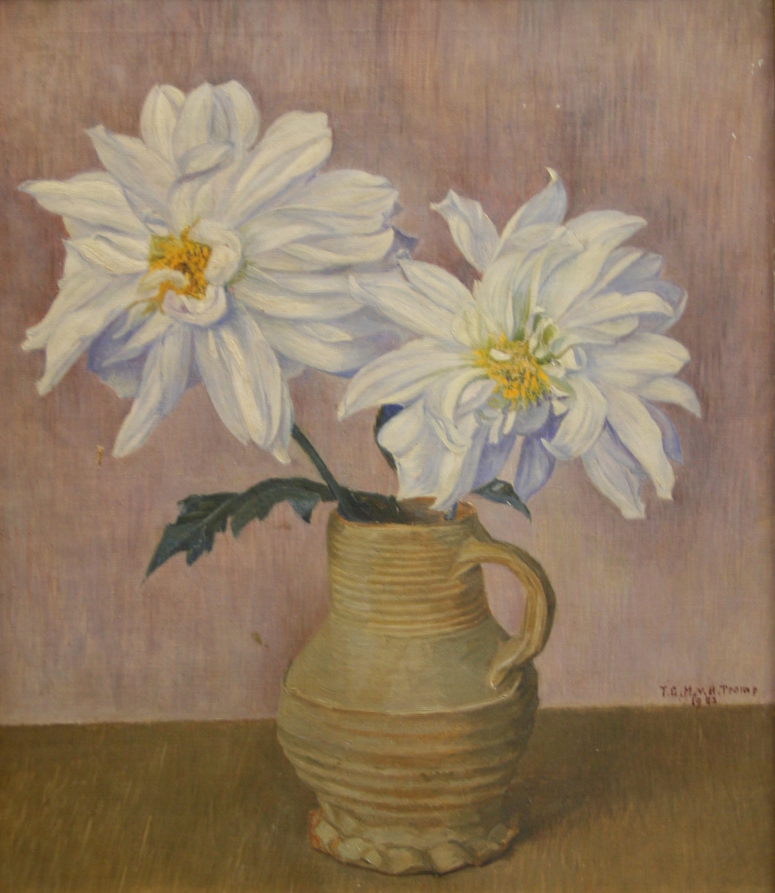 Bloemstilleven van twee witte dahlia's in volle bloei in een bruine kruik met een handvat. De bloemen zijn in verhouding tot de kruik te groot. De bloemen hebben een klein geel hart en slechts een paar bladeren. Op de bruine kruik zijn horizontale lijnen. De achtergrond en ondergrond zijn simpel. Er is een lichte schaduwpartij rechts van de kruik.