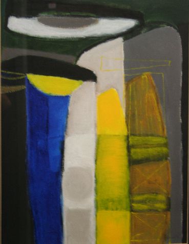 Abstracte compositie van voornamelijk verticale vlakken met rondingen bovenaan. In de linkerbovenhoek zijn ovale figuren, die lijken op een opening in het plafond. Het meest opvallende zijn de blauwe en gele vlakken. De rest is in witte, grijze en zwarte kleuren.