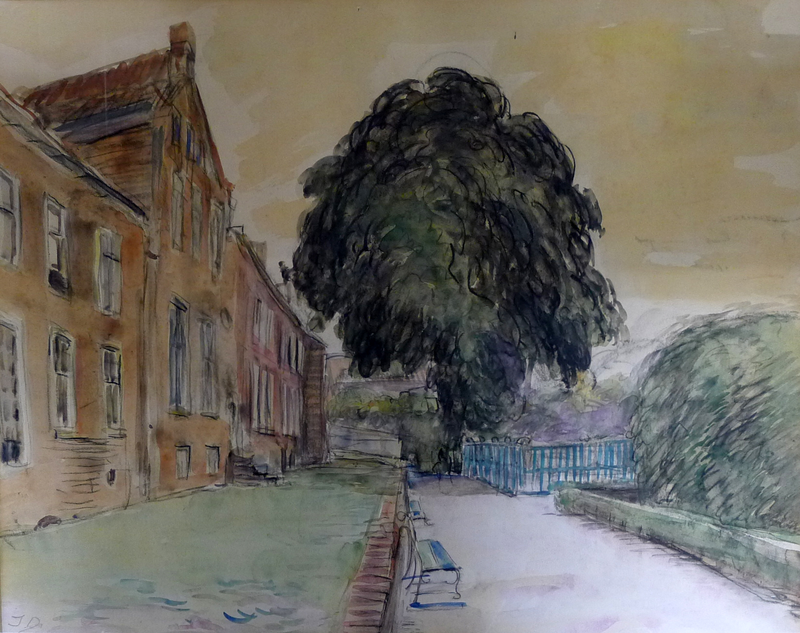 Weergave van een grote boom in de Prinsentuin te Groningen. Links bevindt zich het in lichtbruine en roze tinten het Prinsenhof. Vanaf de voorgrond loopt richting de grote boom een pad met voorbij de struiken aan de rechterkant een afslag naar rechts. Dit pad geeft het kunstwerk een duidelijk perspectief. Dit wordt versterkt door de gebouwen aan de linkerkant. Aan de linkerkant van het pad tegen het lage muurtje staan twee blauwgroene bankjes. Bij de afslag en tot aan de boom staat een blauw hek. De kleuren zijn veelal licht van kleur, maar de grote boom in het midden is erg donker afgebeeld, waardoor deze veel aandacht trekt.