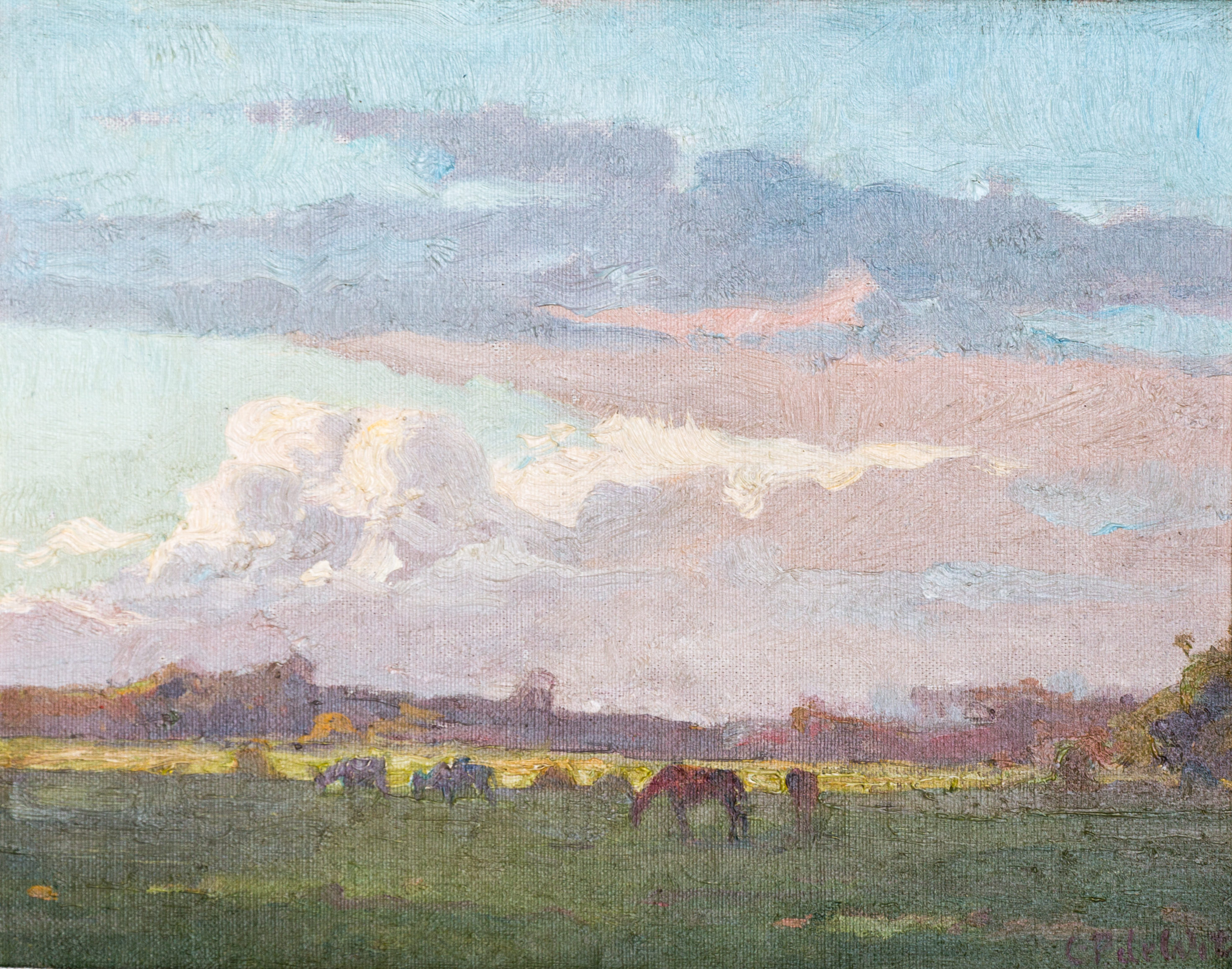 Weergave van een weiland waarin enkele paarden grazen. Voorbij het weiland is een strook land dat geelgroen is, waar waarschijnlijk een ander gewas groeit. In de verte en rechts bevindt zich bos. De horizon is erg laag, zodat de lucht het grootste deel van het kunstwerk inneemt. Het is half bewolkt. De zon schijnt net na zonsopkomst of voor zonsondergang. De wolken in het midden worden in tegenstelling tot de rest van de wolkenpartijen door de zon verlicht en zijn lichtroze van kleur.