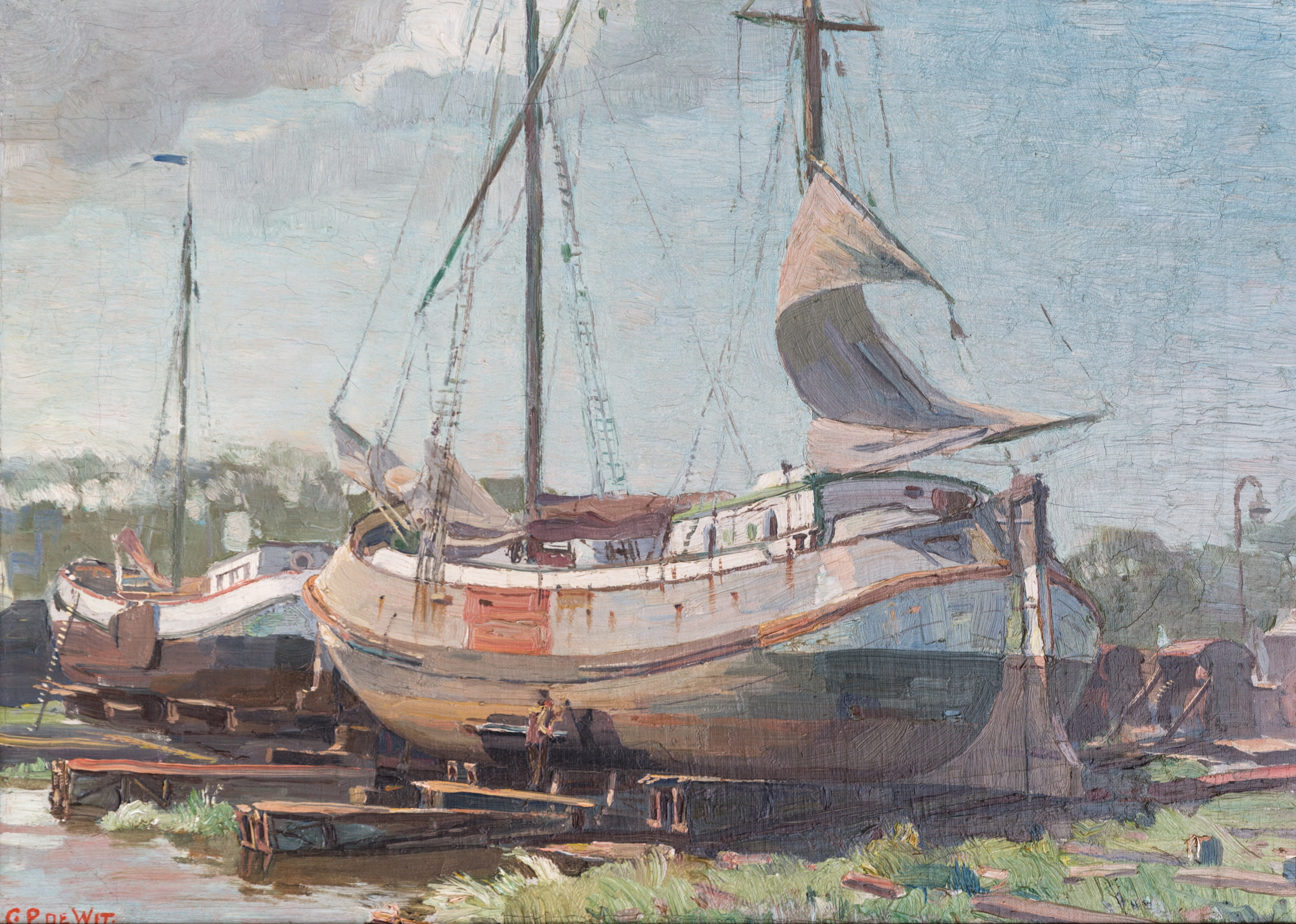 | opschrift | Achterkant: Tweemast koftjalk liggende op een helling. Olieverf op doek door C.P. de Wit |