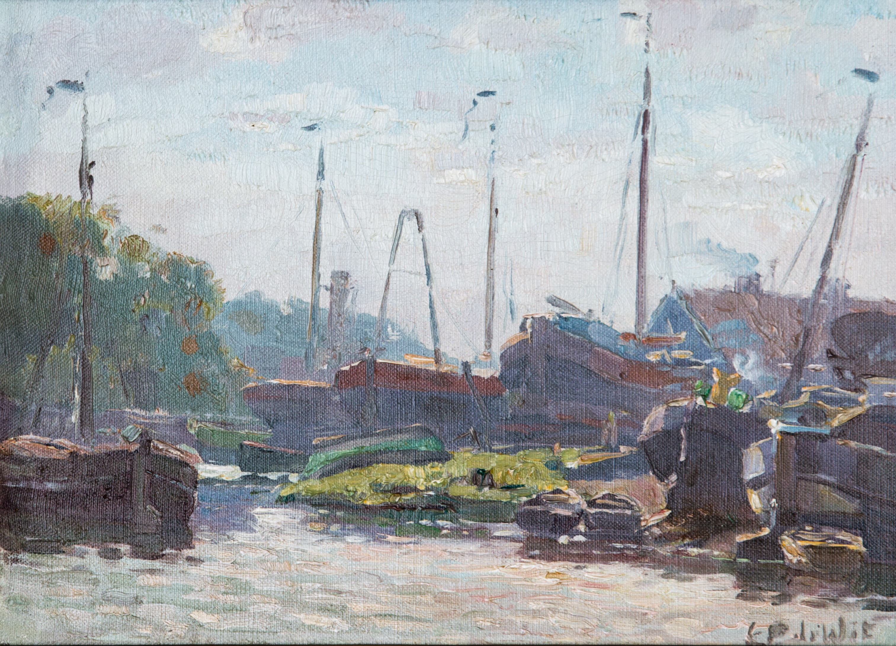 Zicht op een scheepswerf, waar een aantal schepen zowel op het droge als in het water liggen. De grote schepen hebben een mast, waarop een vlaggetje wappert. In het midden onderaan liggen kleine bootjes, waarvan de groene op de kop op de wal ligt. Aan de rechterkant bevindt zich een gebouw met een rood dak en een schoorsteen waaruit rook opstijgt. Aan de linkerkant en in de verte staan bomen. Enkele schepen en de wal zijn weerspiegeld in het water.