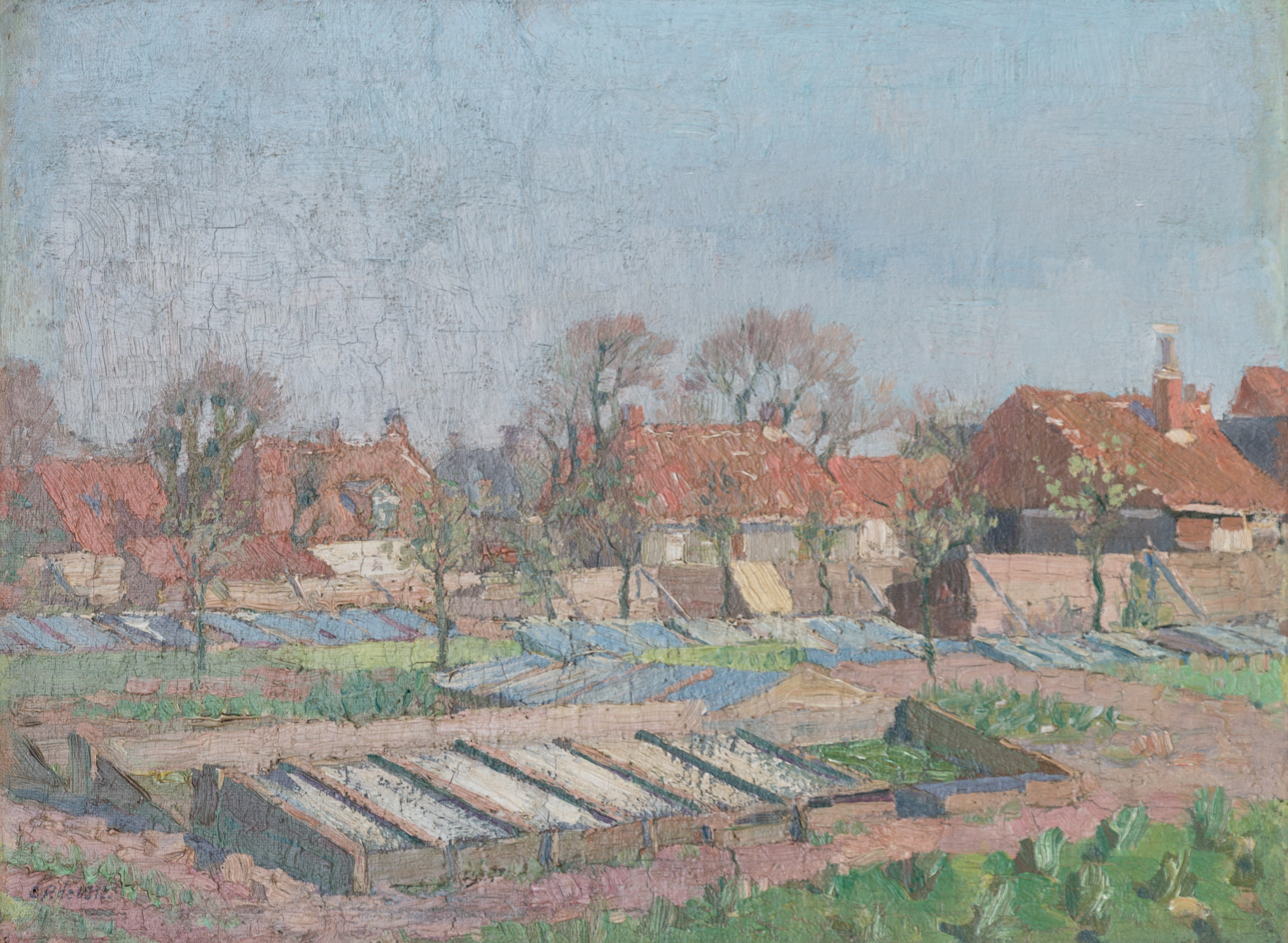 Afgaande op de schaduwpartijen in de broeikassen op de voorgrond en in het rechterdeel van de schutting, komt het licht van rechts. Er is door de plaatsing van de broeikassen enig perspectief dat versterkt wordt door de huizen en bomen in het midden. Er zijn ondanks de vele herkenbare objecten weinig details afgebeeld.