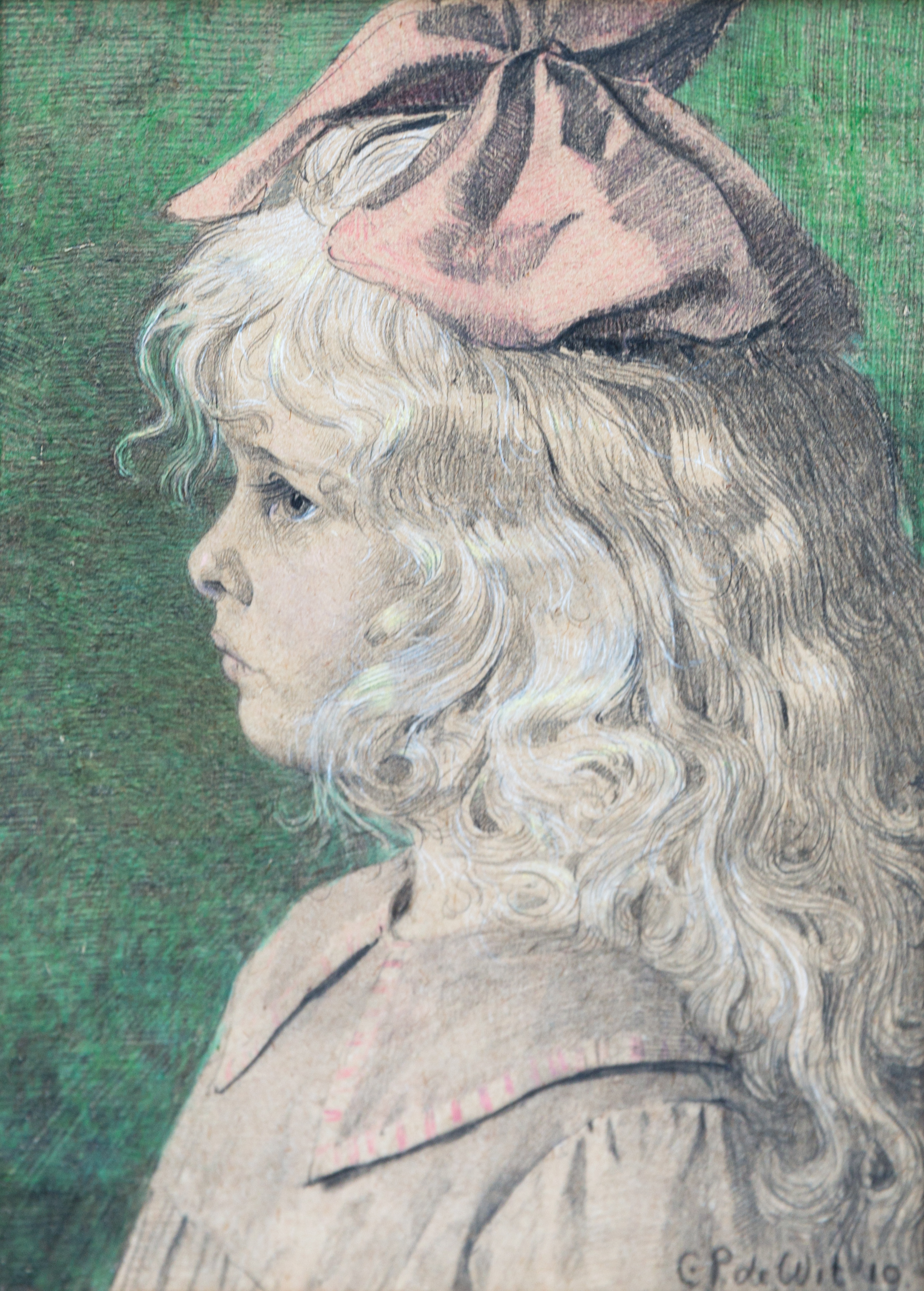 Portret en profile van Alida Elisabeth de Wit, dochter van de kunstenaar. Ze heeft lang blond golvend haar, dat tot op haar rug hangt. Bovenop haar hoofd draagt ze een grote opvallende rode strik. Ze heeft blauwe ogen en lange wimpers. Ze kijkt strak voor zich uit en lijkt een beetje verdrietig. Ze draagt een oranjebruine jurk met een grote kraag. De randen van de kraag hebben rode strepen. Vooral het haar is zeer gedetailleerd afgebeeld.