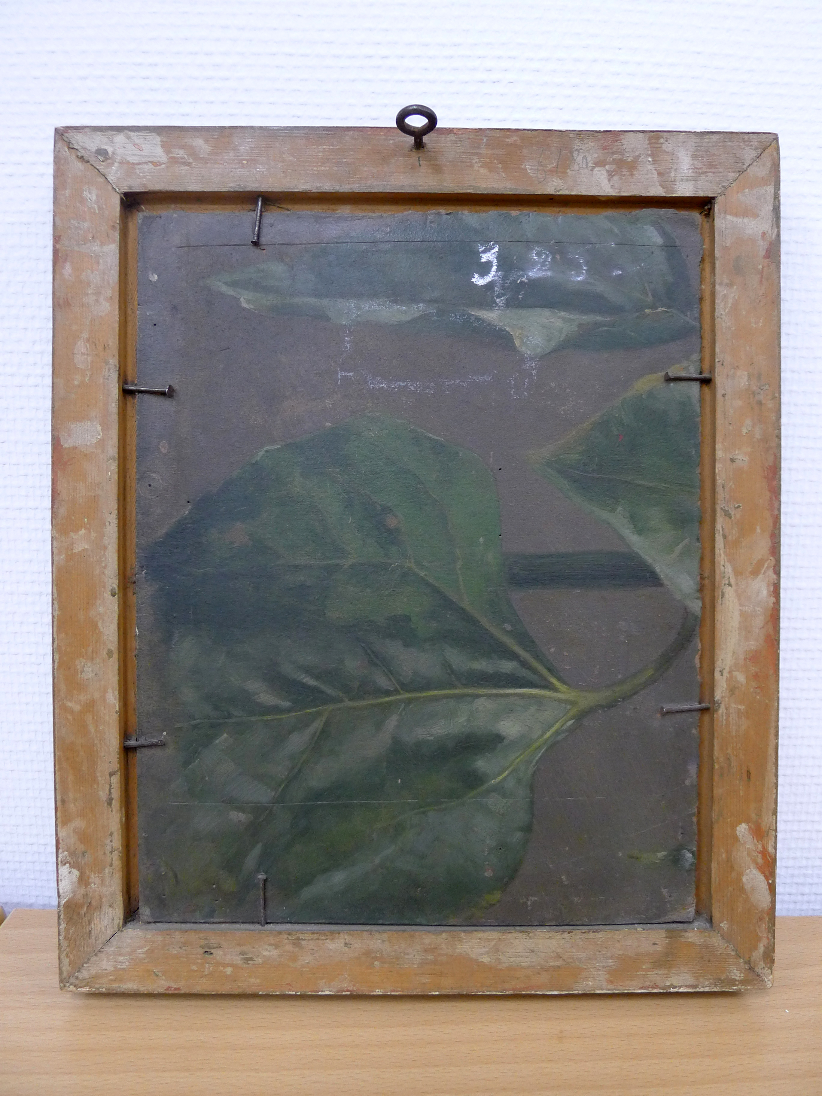 Achterkant: schilderij van bladeren, waarvan de nerven duidelijk zijn weergegeven.