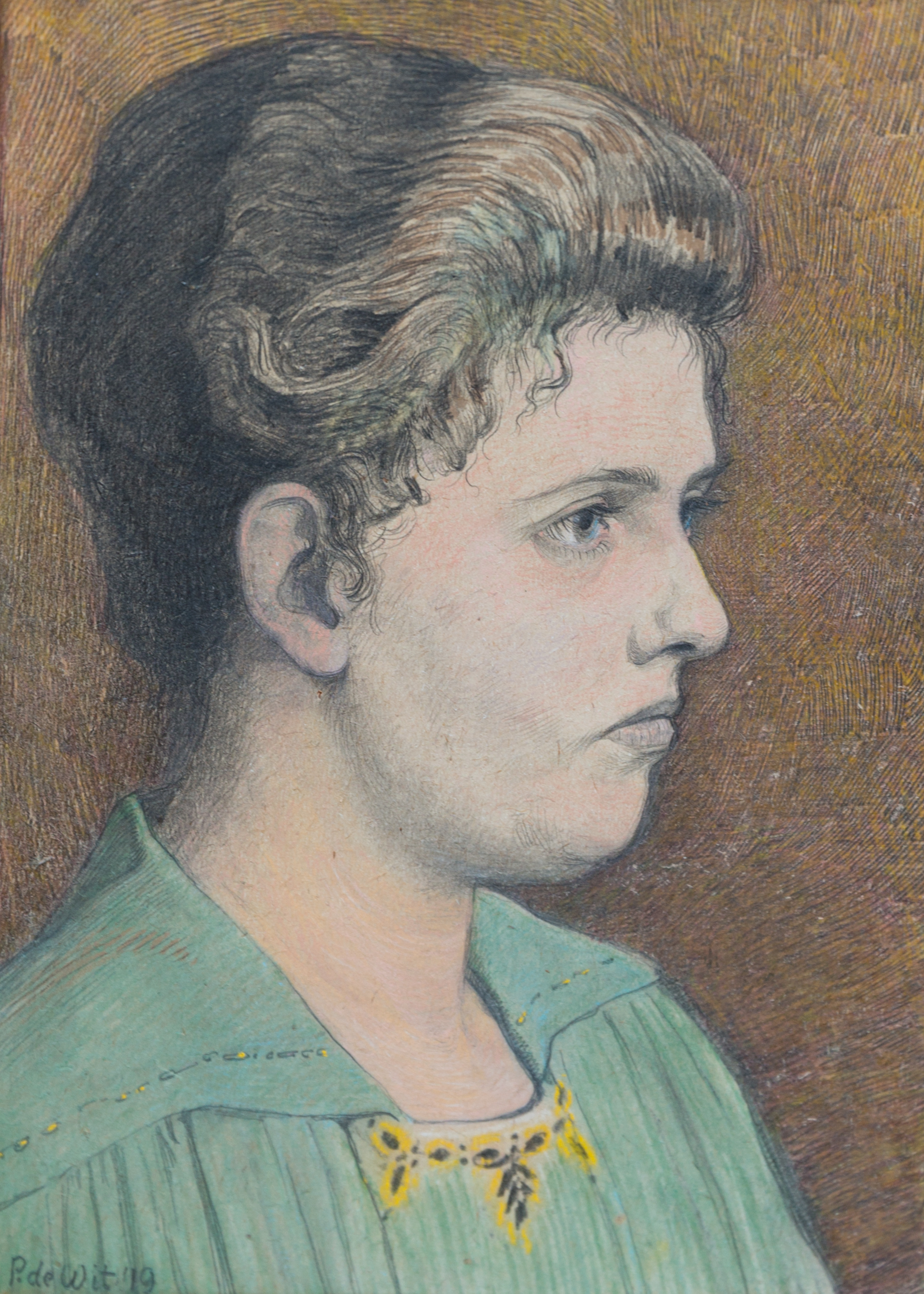 Portret en profile van Alida de Wit, echtgenote van de kunstenaar. Ze heeft blauwe ogen, kort donkerblond licht golvend haar, dat naar achteren is gekamd. Ze kijkt strak voor zich uit. Ze is gekleed in een lichtgroene jurk met kraag. Bij haar hals zijn geelblauwe versieringen aangebracht.