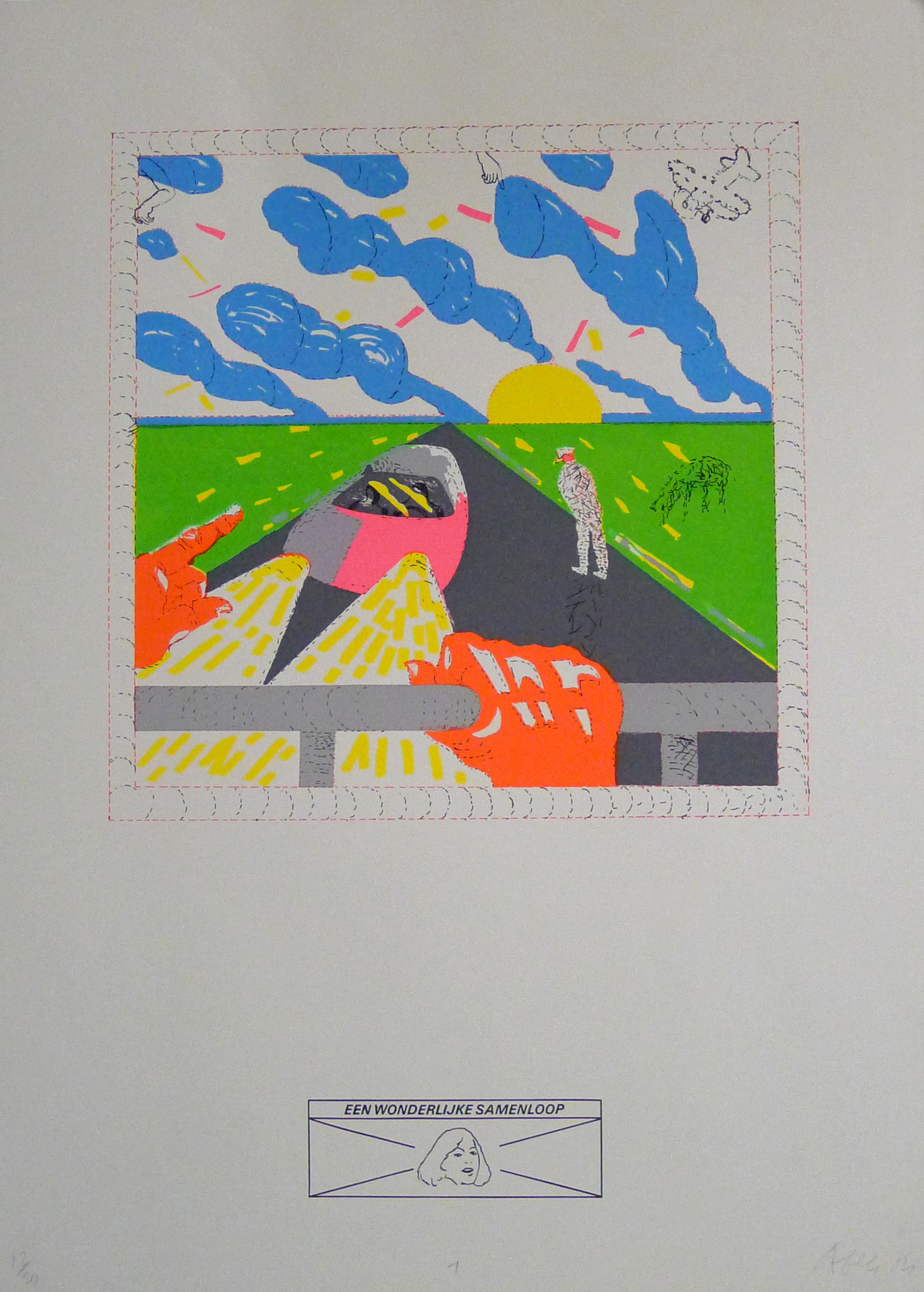 Kleurrijke weergave van een weg in een landschap. Op de weg rijdt een lichtgrijze roze auto. De lichtbundels van de ontstoken lampen zijn duidelijk weergegeven. Rechts op de weg loopt een man in een wit pak met kleine zwarte vlekken. Aan weerszijden van de weg is weiland. Aan de horizon gaat de zon onder. In de lucht zweven blauwe wolken. Ook vliegt er een vliegtuig in de rechterbovenhoek. Op de voorgrond zijn oranje handen zichtbaar vanaf een viaduct, waarvan een deel van de reling zichtbaar is. De linkerhand wijst naar de auto, alsof de persoon op de weg gewaarschuwd wordt. De rechterhand houdt de reling vast.