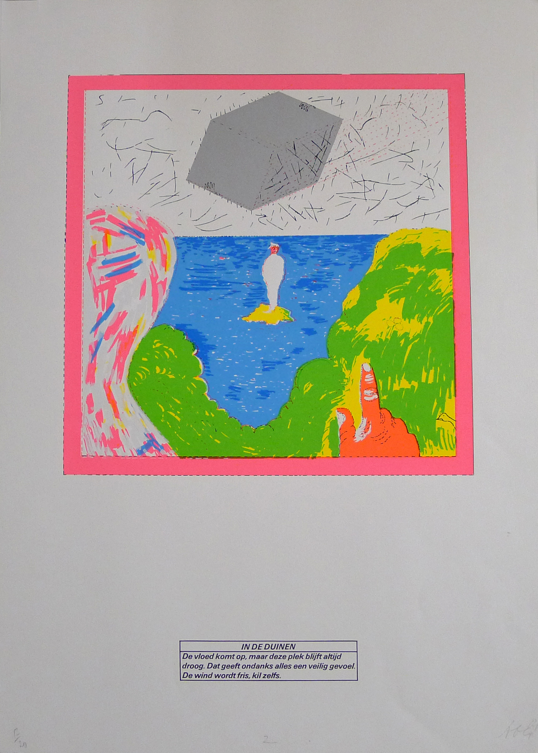 Kleurrijke weergave van een zicht vanuit de duinen op de zee. Aan de linkerkant staat een persoon, die zijn rechtsonder zichtbare rechterhand opsteekt. Op de duinen groeit helmgras. In de zee staat op een klein stukje strand een persoon. Waarschijnlijk kon hij door de vloed niet op tijd op het strand komen. In de witte lucht zijn lijnen kris kras door elkaar aangebracht. Midden bovenin bevindt zich een grijze kubus, die afgaande op de lijnen in het verlengde van de kubus rechts, door het kunstwerk vliegt.