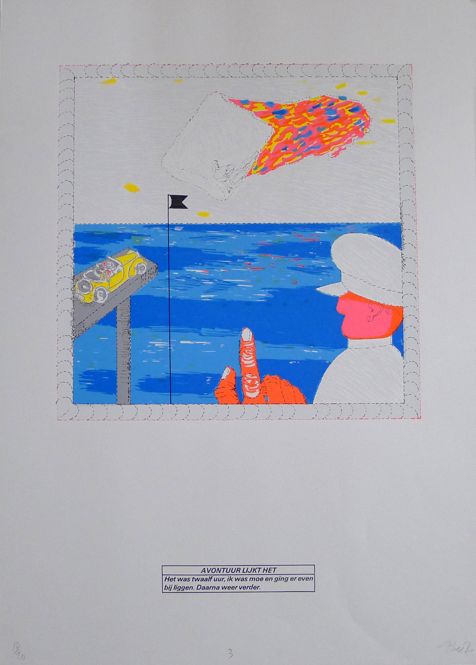 Zicht op de blauwe zee. Linksonder is een deel van een pier afgebeeld, waarop een gele cabriolet staat. Rechtsonder staat een man met een witte pet op en gekleed in een witte jas. Op de voorgrond wijst een rechterhand naar boven richting een vierkant vlak dat door de lucht vliegt. Aan de rechterkant laat het vierkante vlak een kleurrijk spoor achter. In het vierkante vlak zit een figuur die niet duidelijk is afgebeeld.