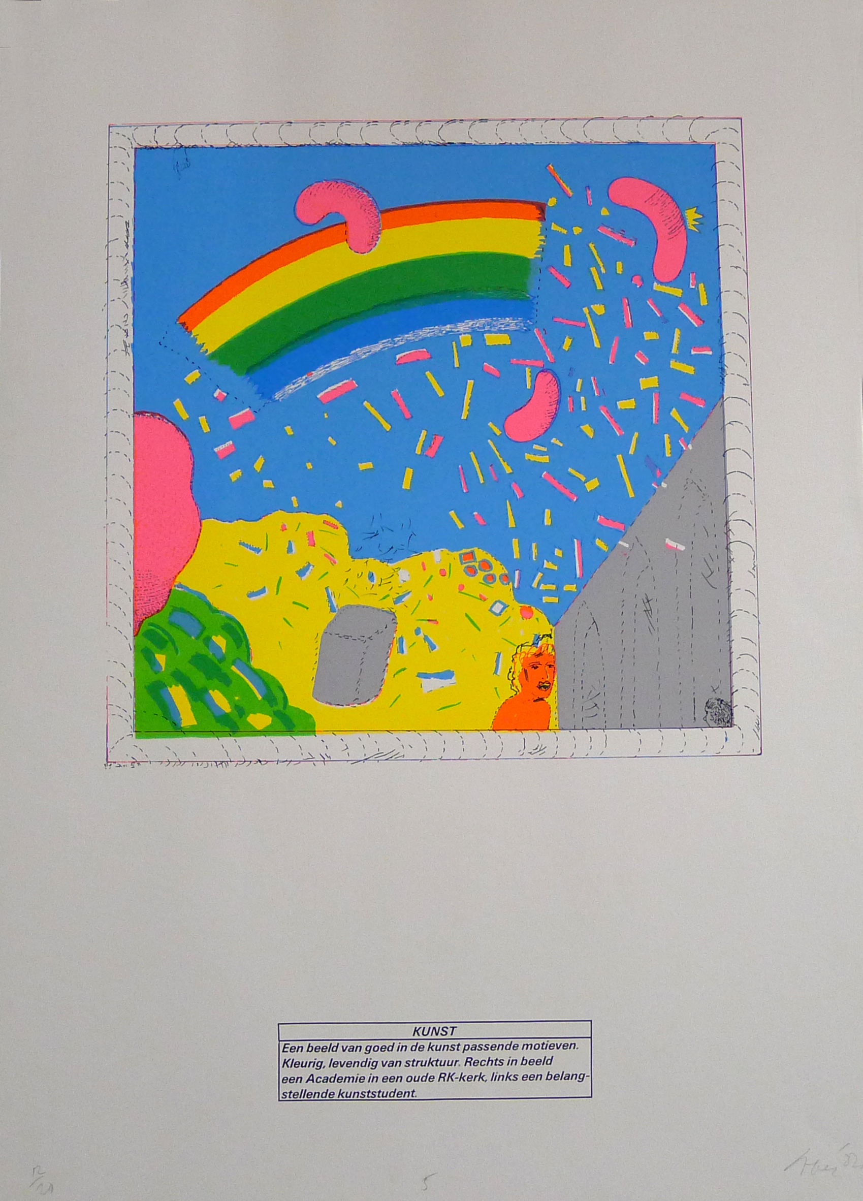 Kleurrijke weergave van verschillende objecten. Aan de rechterkant staat een deel van een kerk. Links van de kerk staat een persoon. Linksonder staat een andere persoon. Op de achtergrond bevindt zich een duin, waarvoor een grijze kubus is afgebeeld. In de blauwe lucht is een gedeeltelijke regenboog zichtbaar en zweven allerlei kleurrijke figuren.