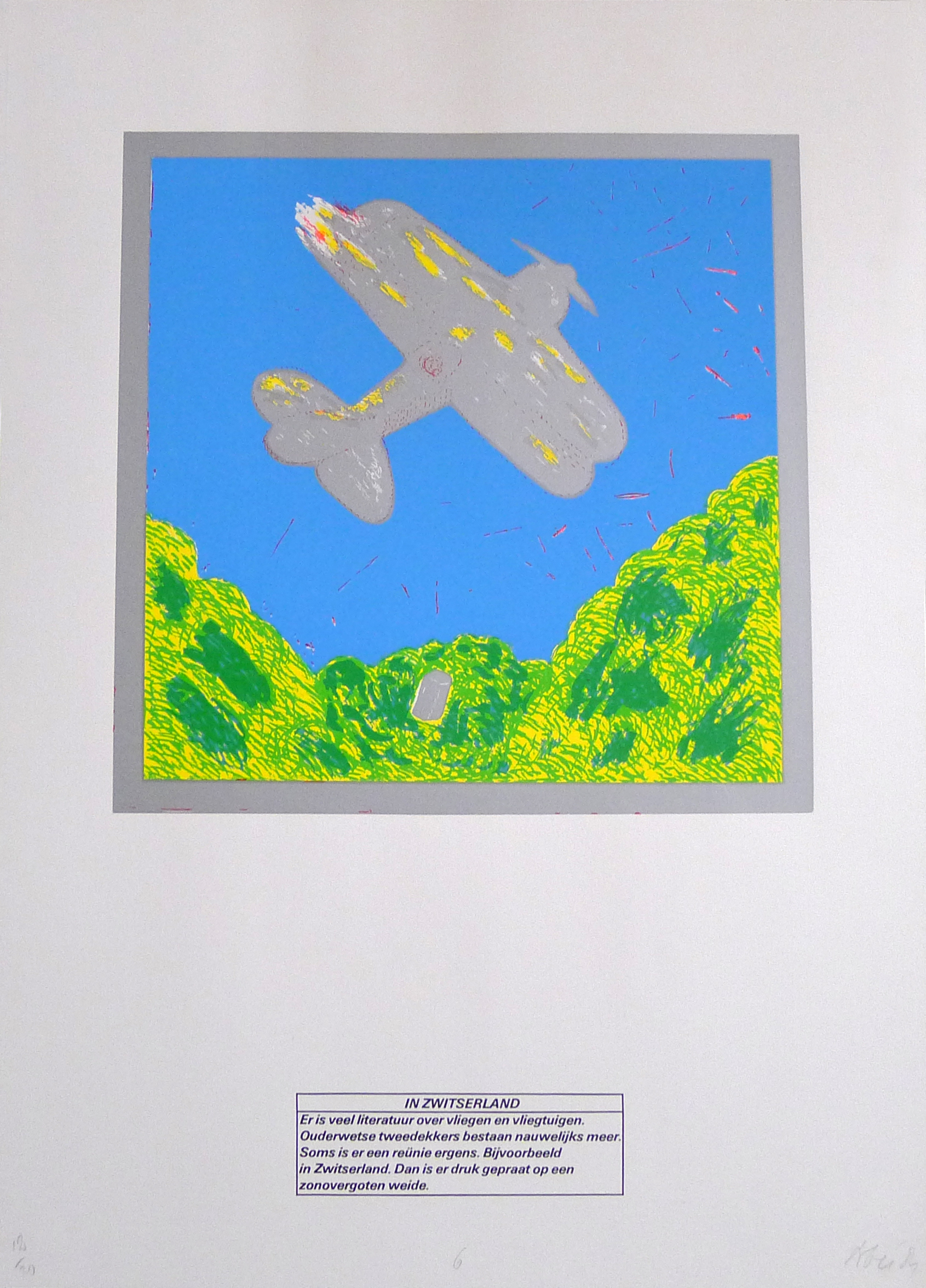 Kleurrijke weergave van een landschap. De grijze tweedekker in de blauwe lucht trekt meteen de aandacht. Onderaan zijn begroeide heuvels.