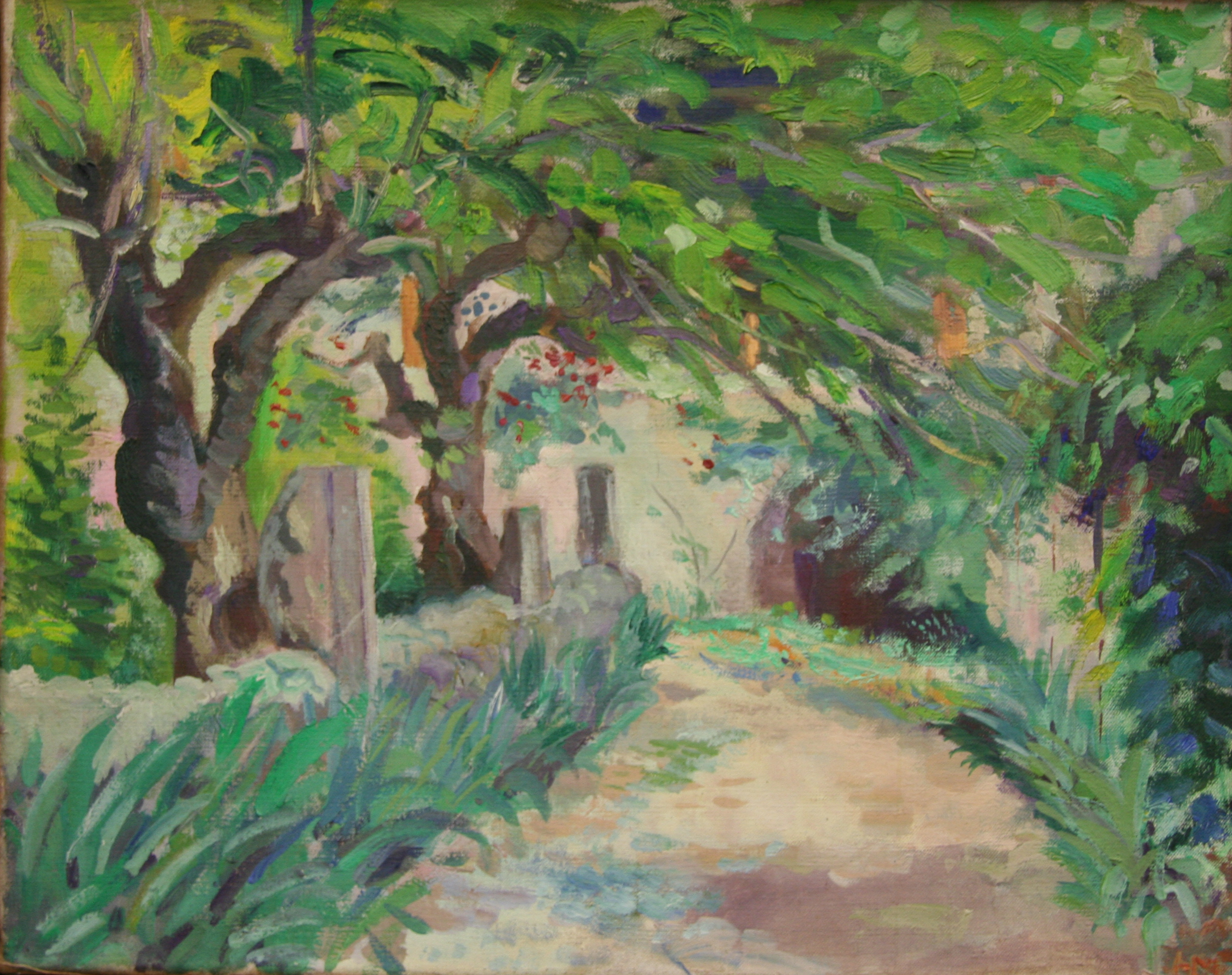Zicht op een weggetje naar een boerderij. Aan weerszijden groeien lage planten. Links van de weg staat een laag muurtje van keien. Erachter staan twee hoge bomen, waarvan de takken tot ver over het pad hangen. Dit versterkt het perspectief dat door het pad richting de boerderij ontstaat. Tussen de bomen en aan het eind van het pad is de boerderij te zien, waarvan de muren lichtbruin zijn gepleisterd. In de linkerhelft tegen de muur bloeien rode bloemen.