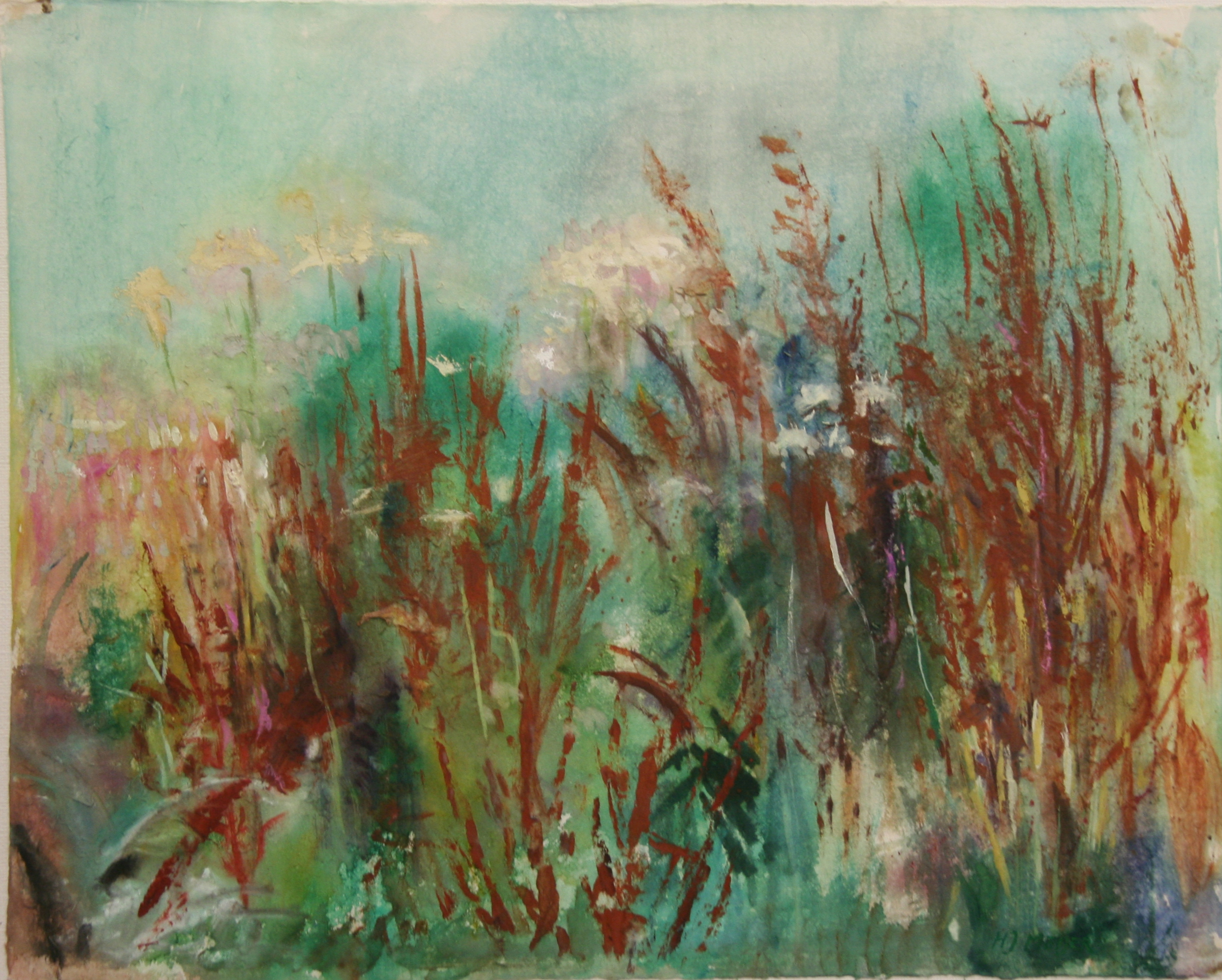 Weergave van een groep planten, waarvan de roodbruine zuring het meest herkenbaar is. Deze is het meest gedetailleerd afgebeeld. Tussen de zuring staan planten met witte bloemen en andere onduidelijke planten.