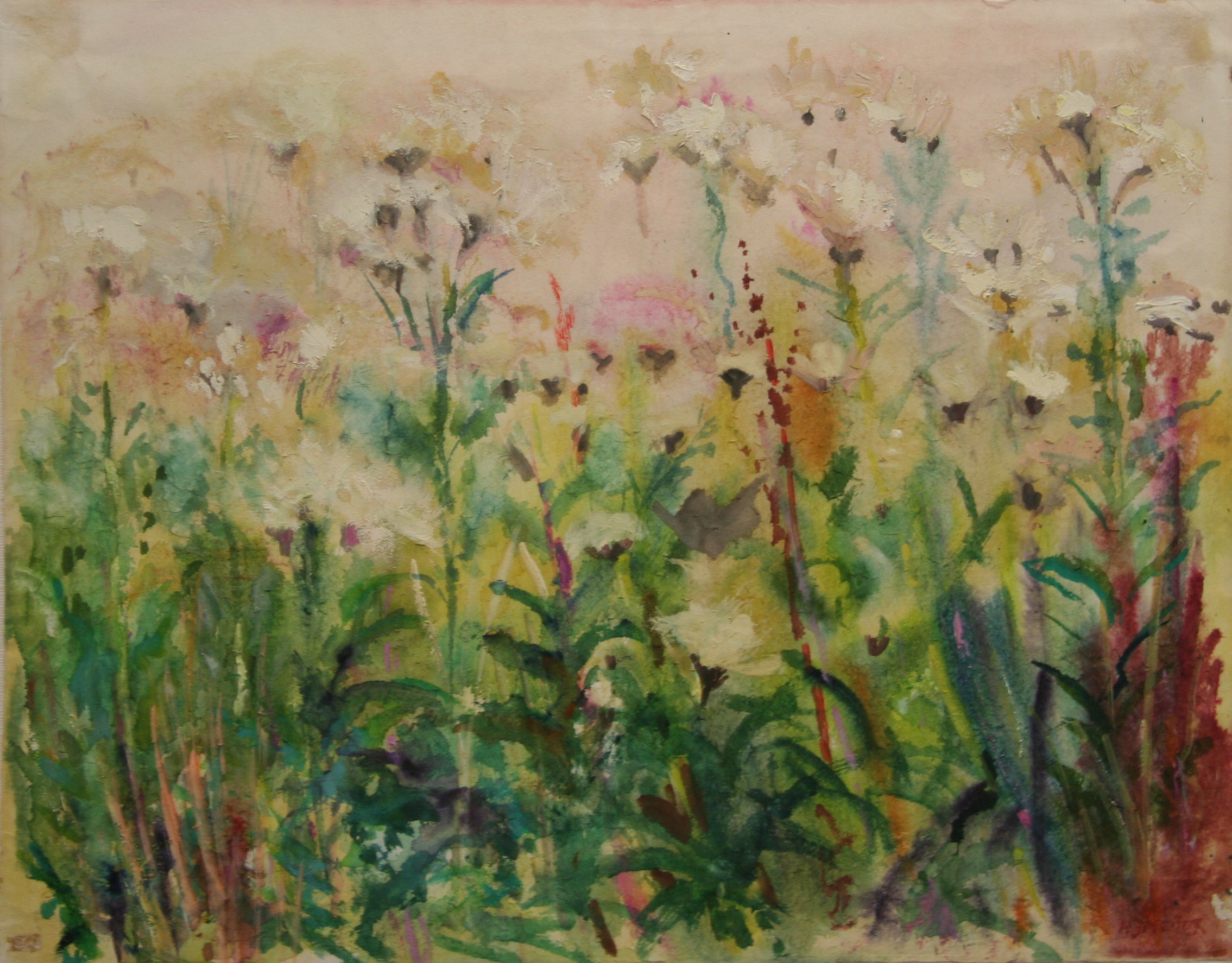 Door de toegepaste techniek van brede penseelvoering is het niet duidelijk welke planten zijn afgebeeld.