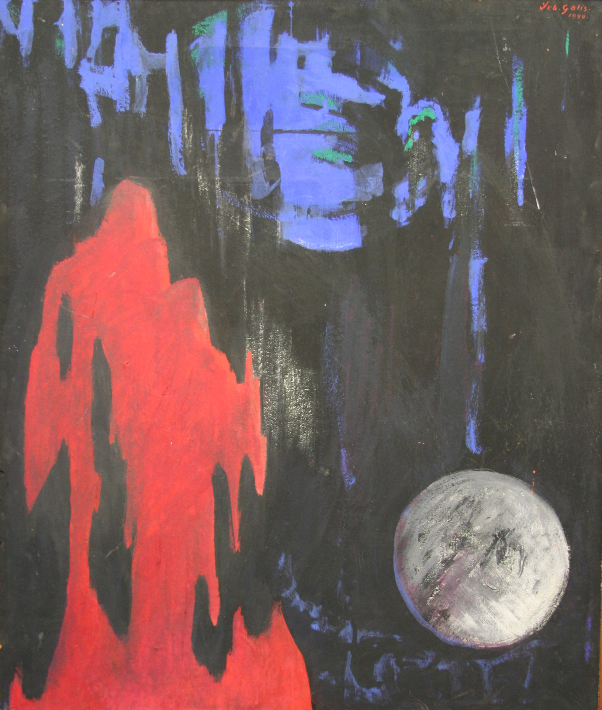 Abstracte weergave in rood en blauw. Bovenaan zijn vooral blauwe verticale strepen aangebracht. Bovenaan in het midden is een groter blauw amorf vlak. Aan de linkerkant is een rood eveneens amorf vlak, dat als het ware naar beneden lijkt te stromen door de verticale uitsteeksels. In tegenstelling tot het blauwe vlak is het rode vlak één vlak. Rechtsonder is een witte maanachtige bol afgebeeld. De achtergrond is zwart, waardoor er een groot contrast is ontstaan met de gekleurde vlakken.