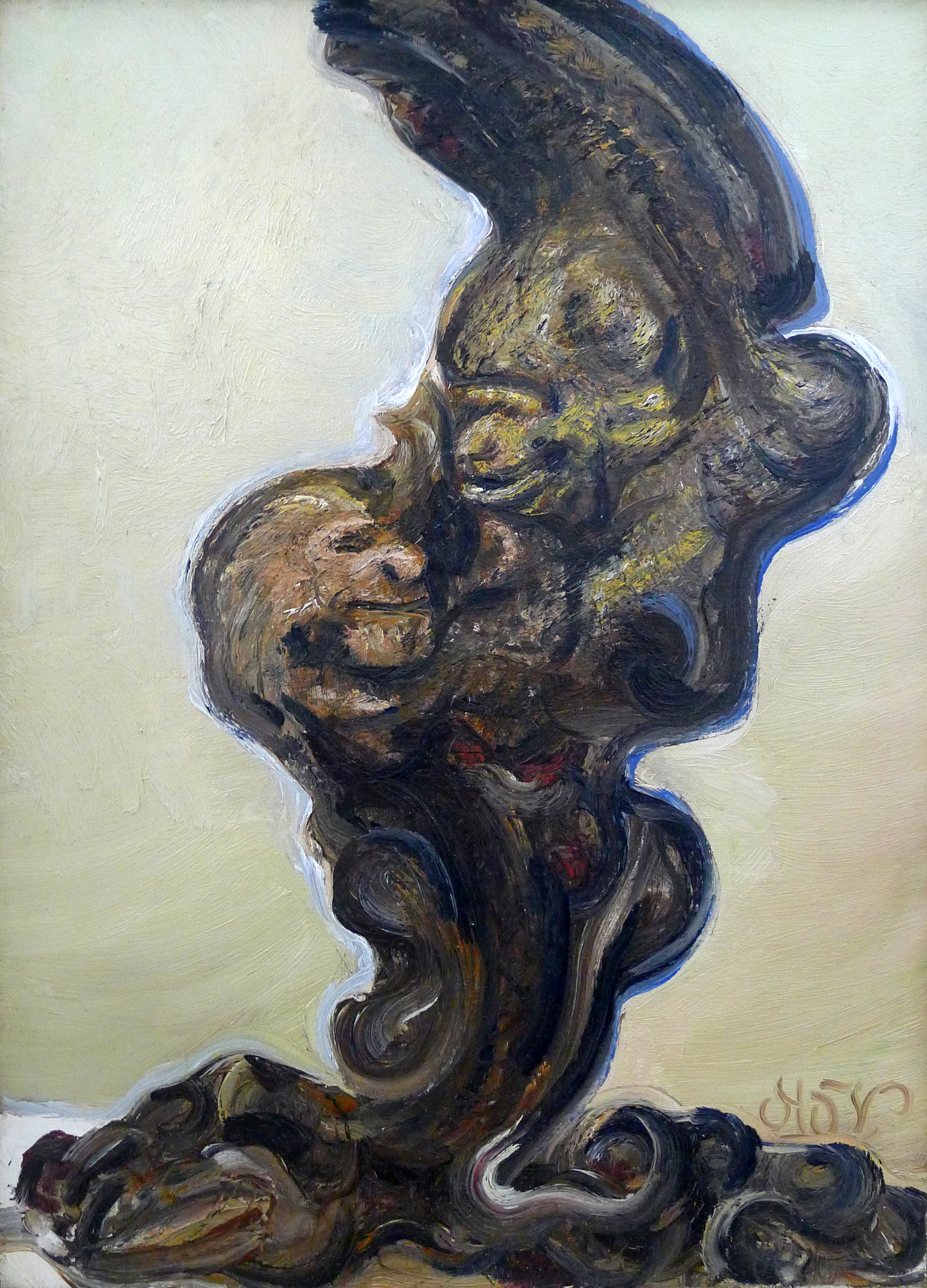 Bovenaan lijkt de groep een vleugel te hebben. Halverwege de groep zijn hoofden van de vreemde gedrochten te zien. De bovenste heeft een snuit als van een aap. Linksonder ervan is een lichtbruin roze ronde kop, die de tanden duidelijk laat zien. Eronder zijn in het donkerbruin de duivelsrode ogen van een derde kop zichtbaar.