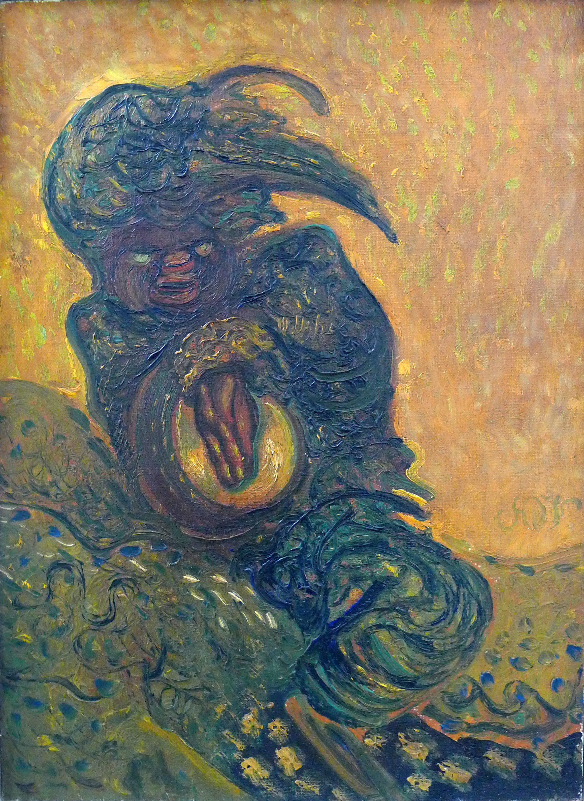 Hij zit op een steen, boom of iets anders, wat niet duidelijk te herkennen is. Aan beide kanten heeft hij een been, waardoor zijn rechterbeen niet te zien is. De achtergrond is okergeel en oranje, die zeer contrasteert met de figuur.