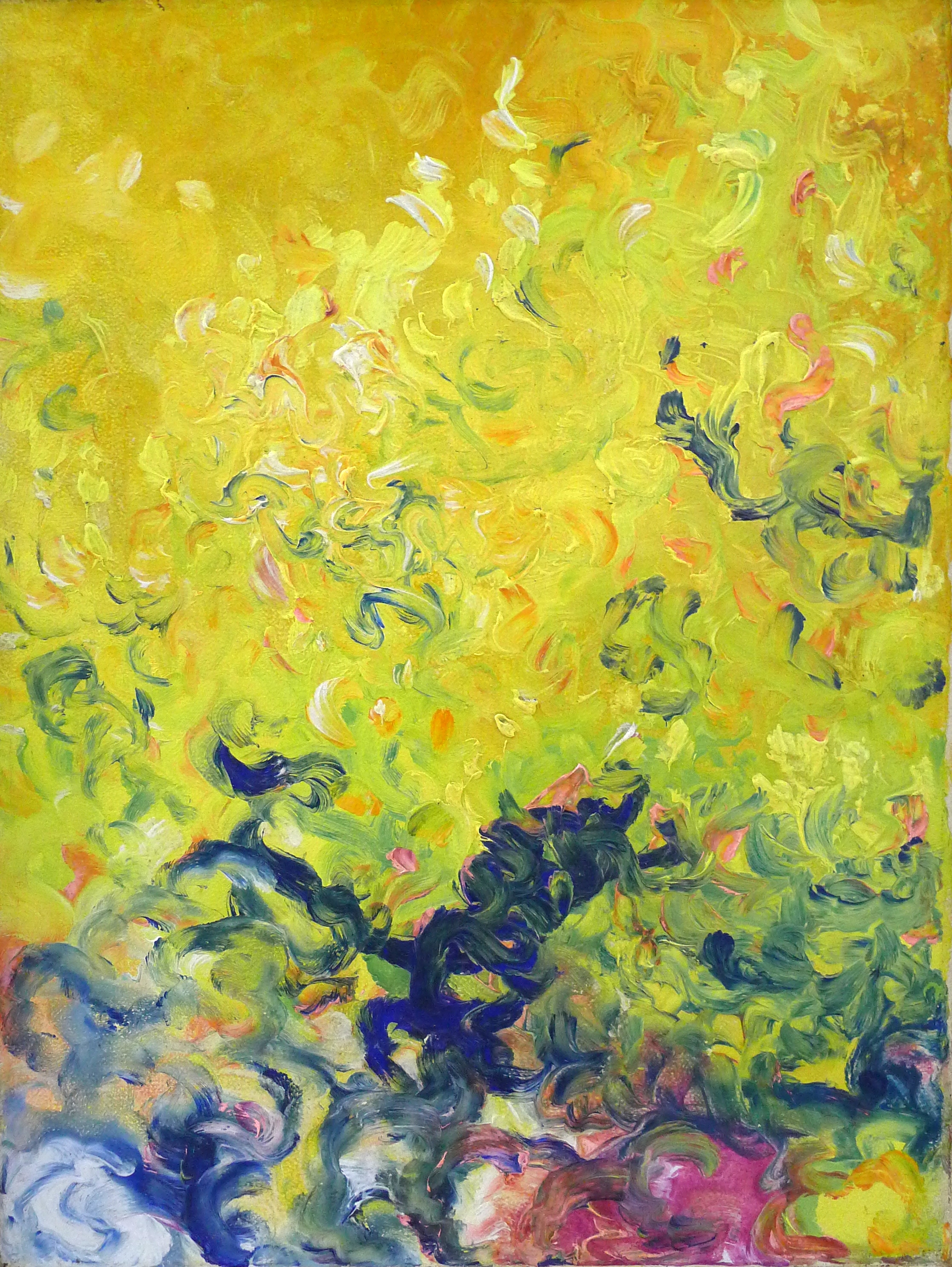 Kleurrijke, abstracte impressie van een bloesemboom. De kleuren zijn fel toegepast. Vooral het geeloranje overheerst. Onderaan zijn de kleuren donkerder en diverser. Tussen het geel is het groen, paars, lichtblauw en donkerblauw. Het donkerblauw stelt de boomstam voor met enkele dikke takken.