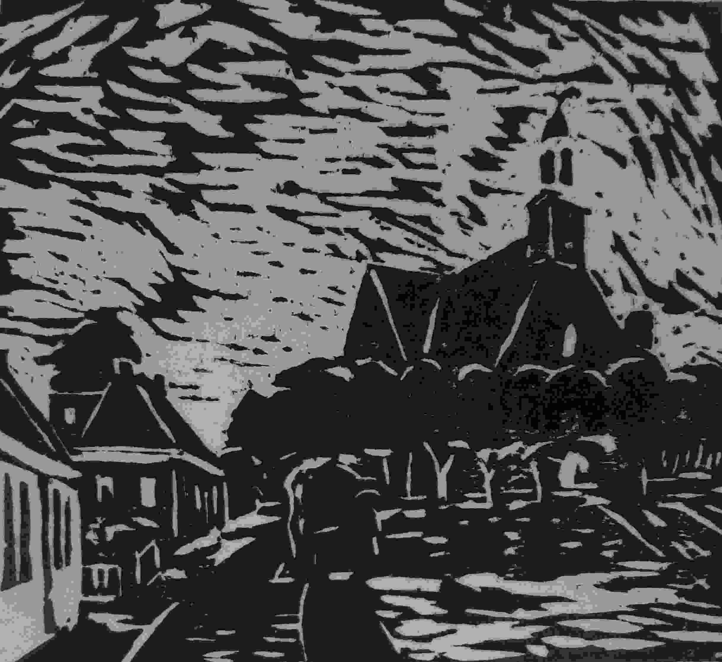 Afgezien van het eerste huis op de voorgrond zijn alle afgebeelde objecten donker afgebeeld. De contouren worden aangegeven door witte lijnen.