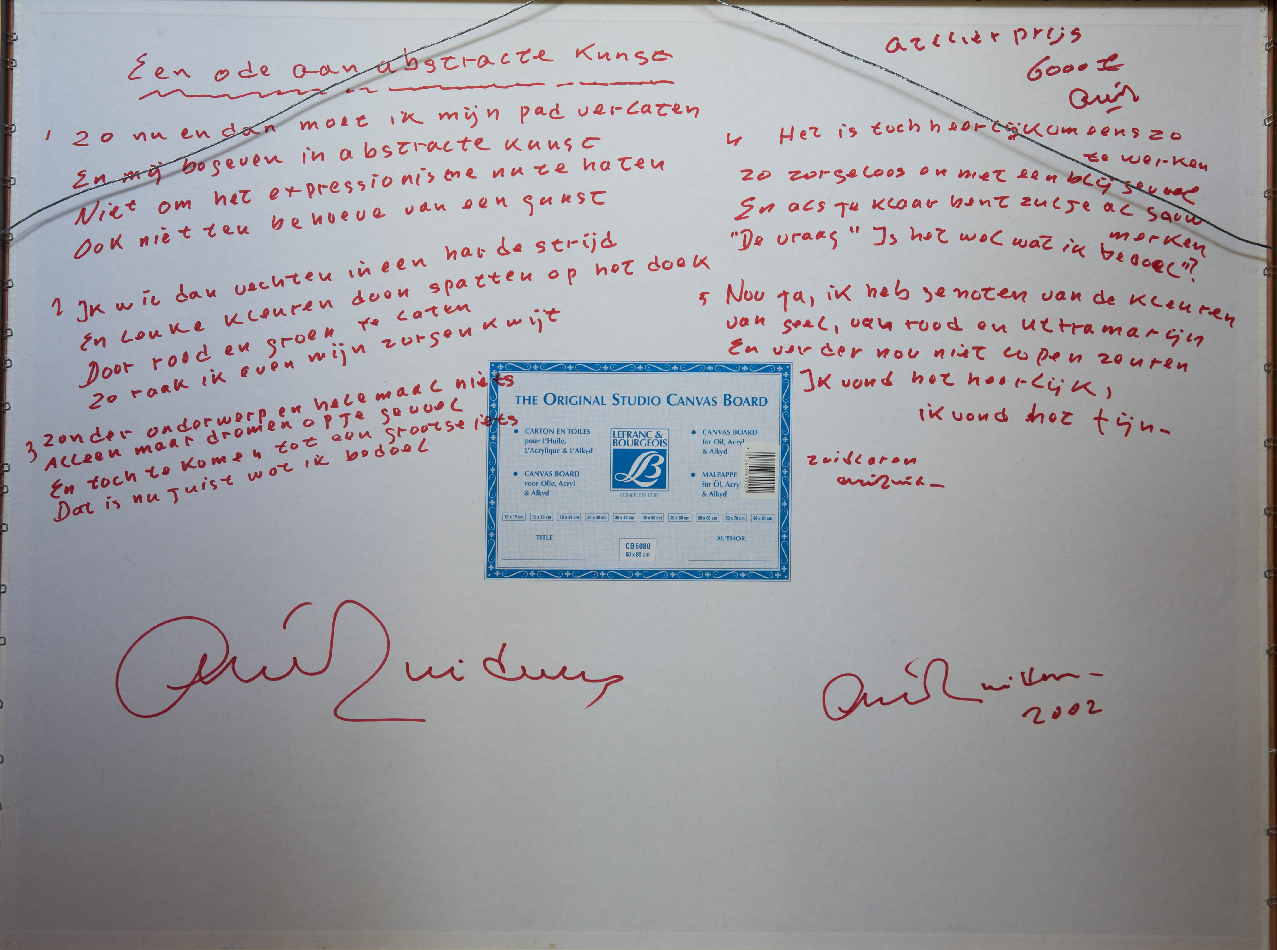 | opschrift | Achterkant: Gedicht 'Ode aan abstracte kunst'. Zuidlaren, Arie Zuidersma, 2002 |