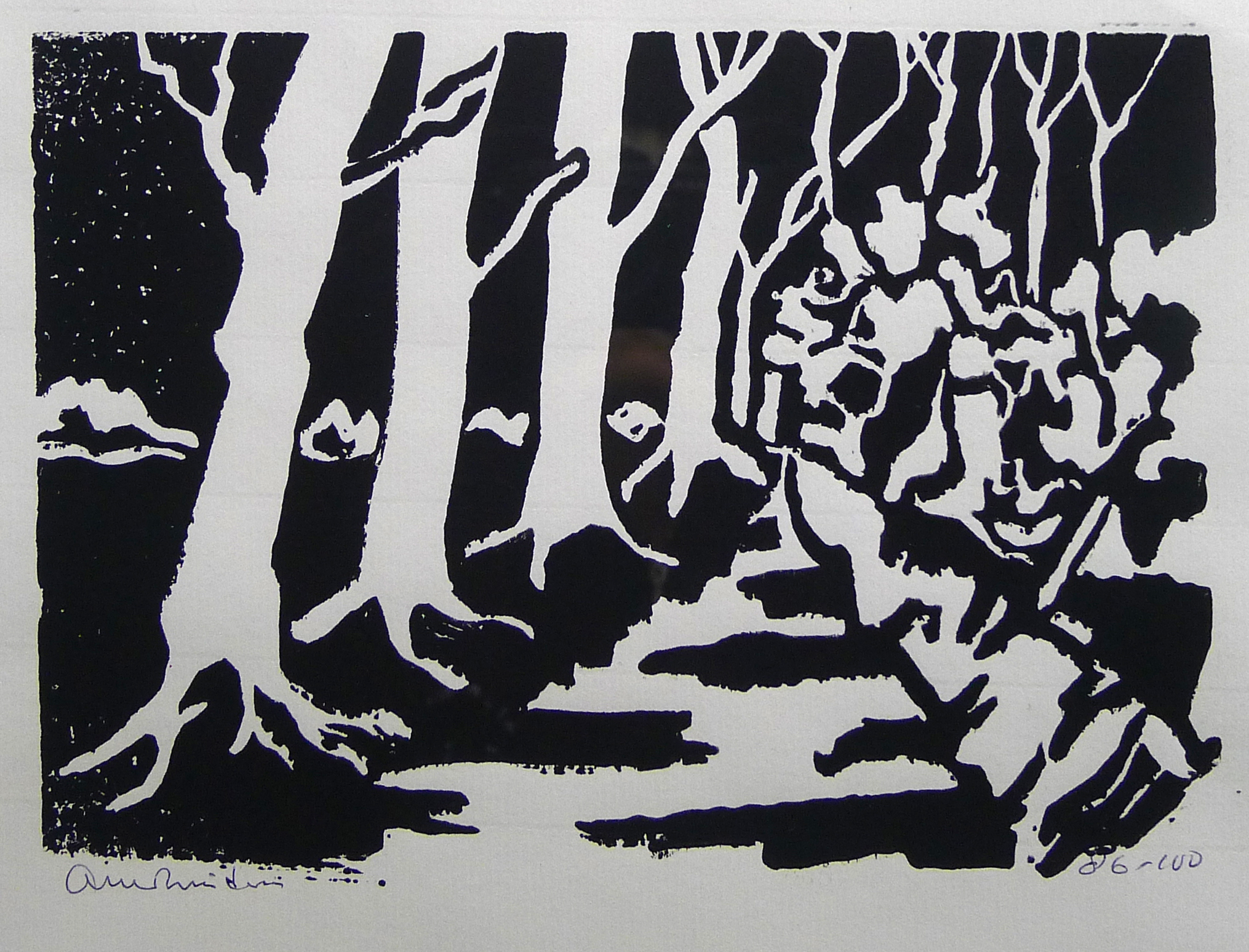 | opschrift | rechtsonder 86 - 100 achterkant: linosnede, Laan met bomen, Arie Zuidersma |