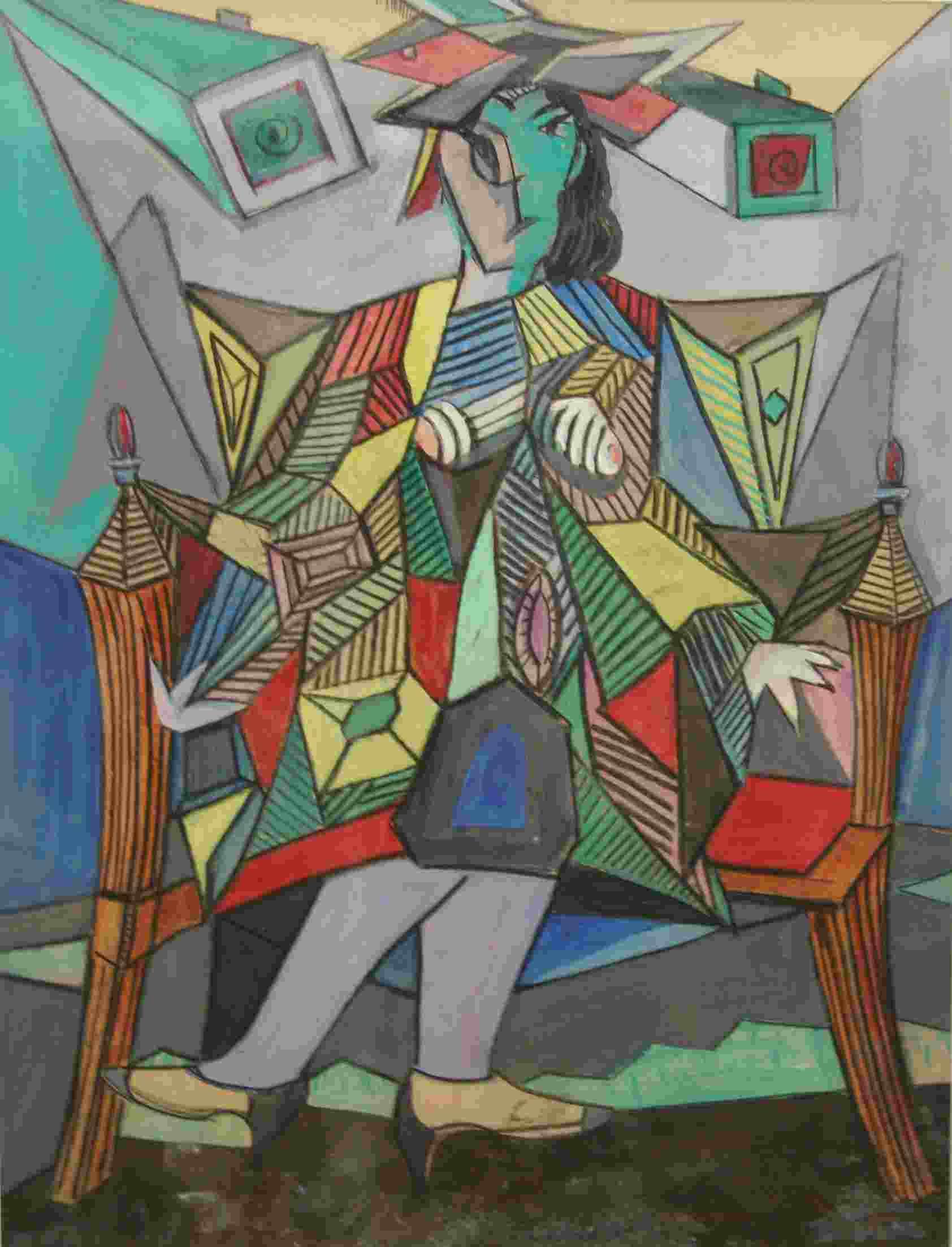 In dit kunstwerk heeft Galis in pastelkrijt een persoon getekend die rechtop in een stoel zit en je recht aankijkt. De figuur is gefragmenteerd weergegeven. De anatomie is ontleed in een groot aantal geometrische vlakjes, waarin verschillende lichaamsdelen te herkennen zijn. De totale indruk is er een van feestelijke kleurigheid waarin voor groen een verbindende hoofdrol is weggelegd.