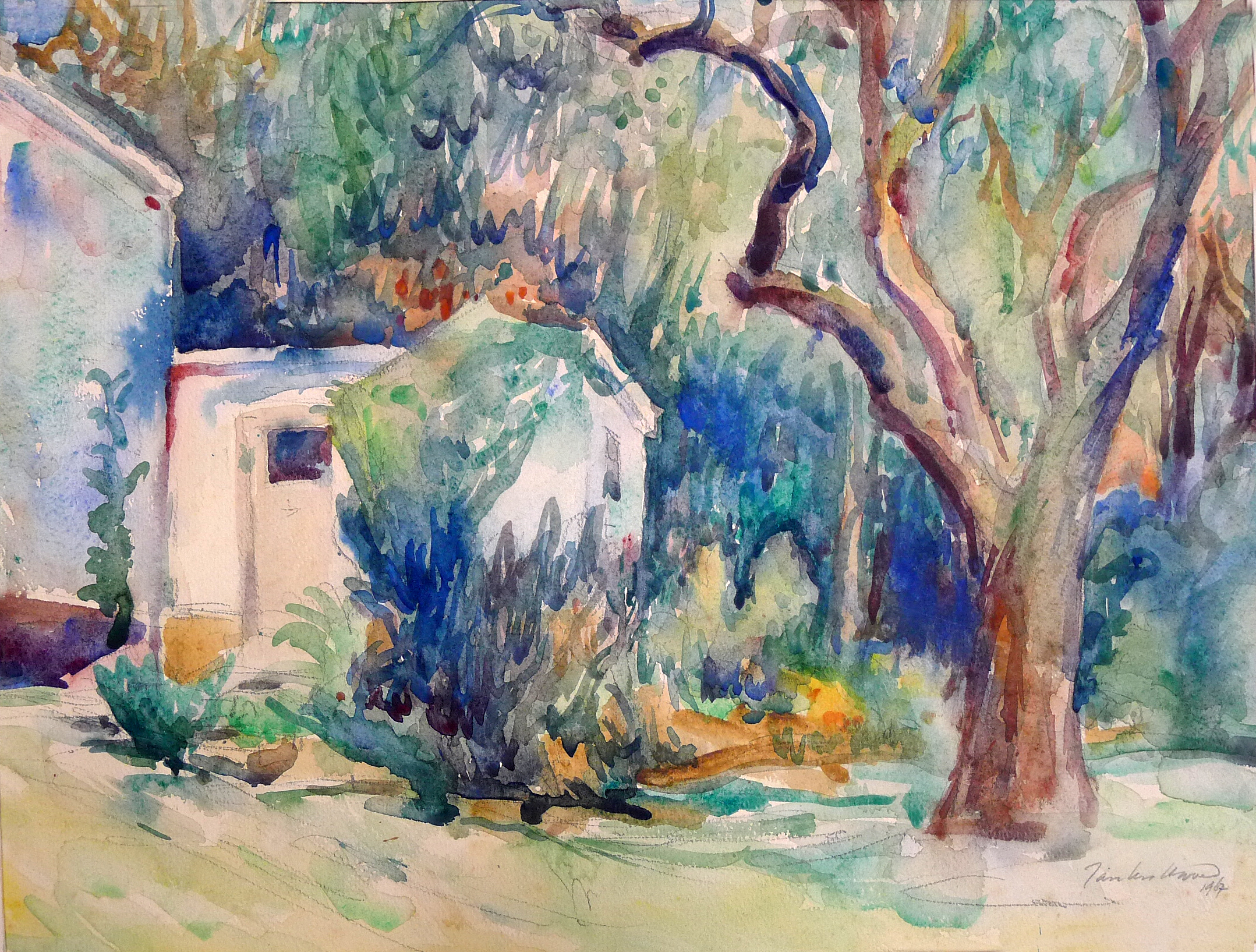 Links witgroen huis, gedeeltelijk zichtbaar, klein bijgebouw, grote boom rechts, verderop bos, gras op voorgrond.