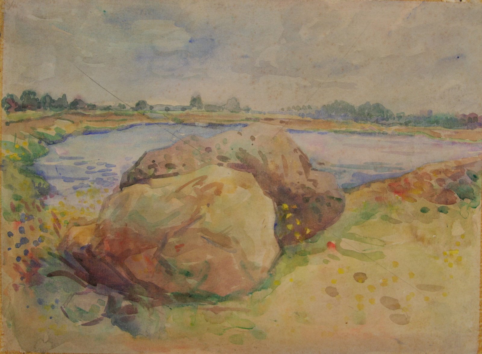 | opschrift | Achterkant: aquarel van meertje met keien |