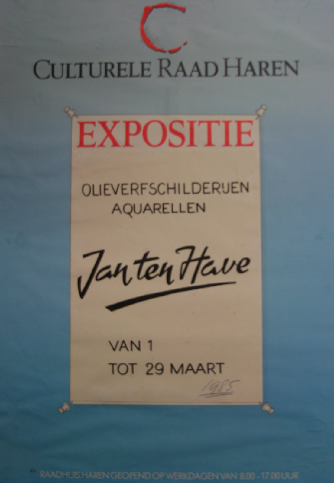 | opschrift | Culturele Raad Harne, Expositie, Olieverfschilderijen, Aquarellen, Jan ten Have, van 1 tot 29 maart 1985, Raadhuis Harne geopend op werkdagen van 8.00-17.00 uur |