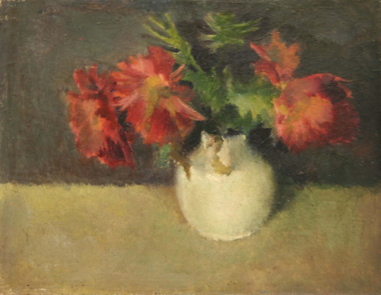 Bloemstilleven van een wit vaasje met rode begoniabloemen in volle bloei. In het midden van het boeket zijn de bladeren van de begonia. Verhoudingsgewijs is het vaasje te klein voor de vier grote bloemen. Het vaasje staat op een lichtbruine ondergrond.