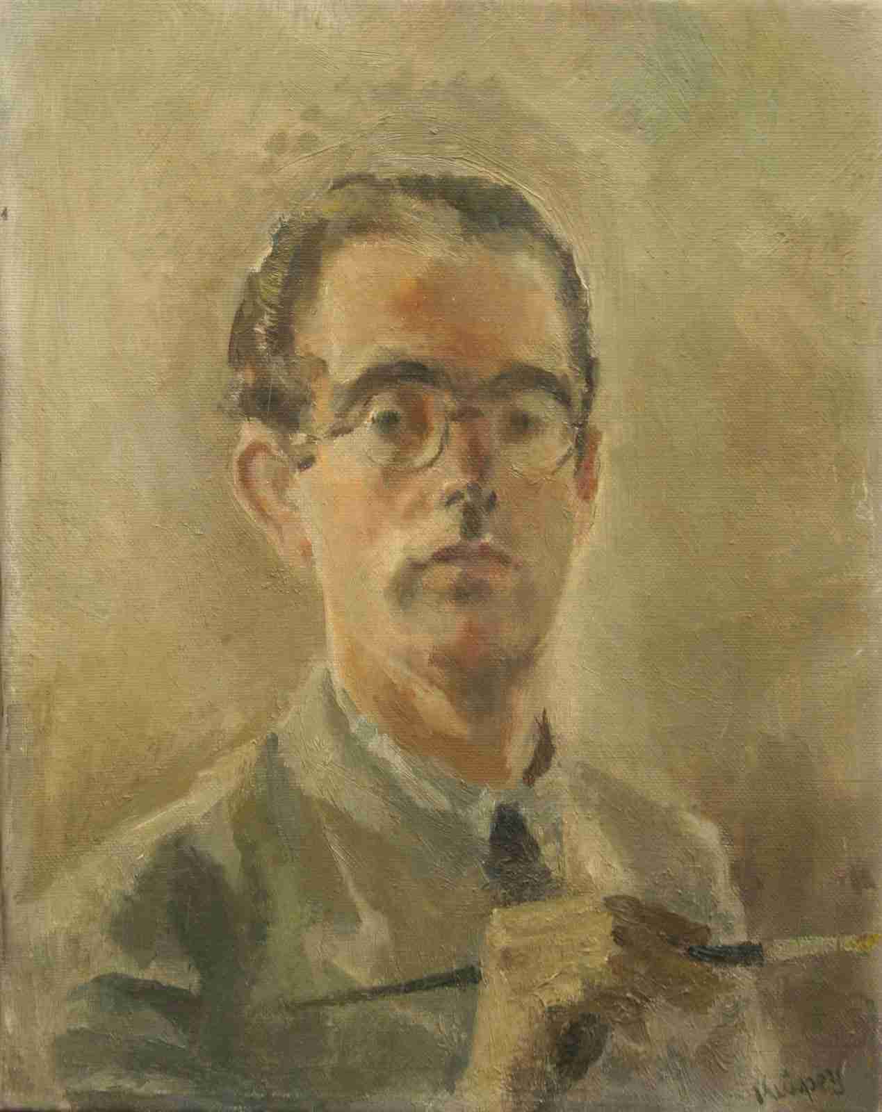 Zelfportret en face. Hij heeft kort bruin haar en draagt een bril met ronde glazen. Hij is gekleed in een licht overhemd met een lichtbruine jas en een donkere stropdas. In zijn rechterhand houdt hij een penseel. De stijl ligt tussen Kort en expressionisme.