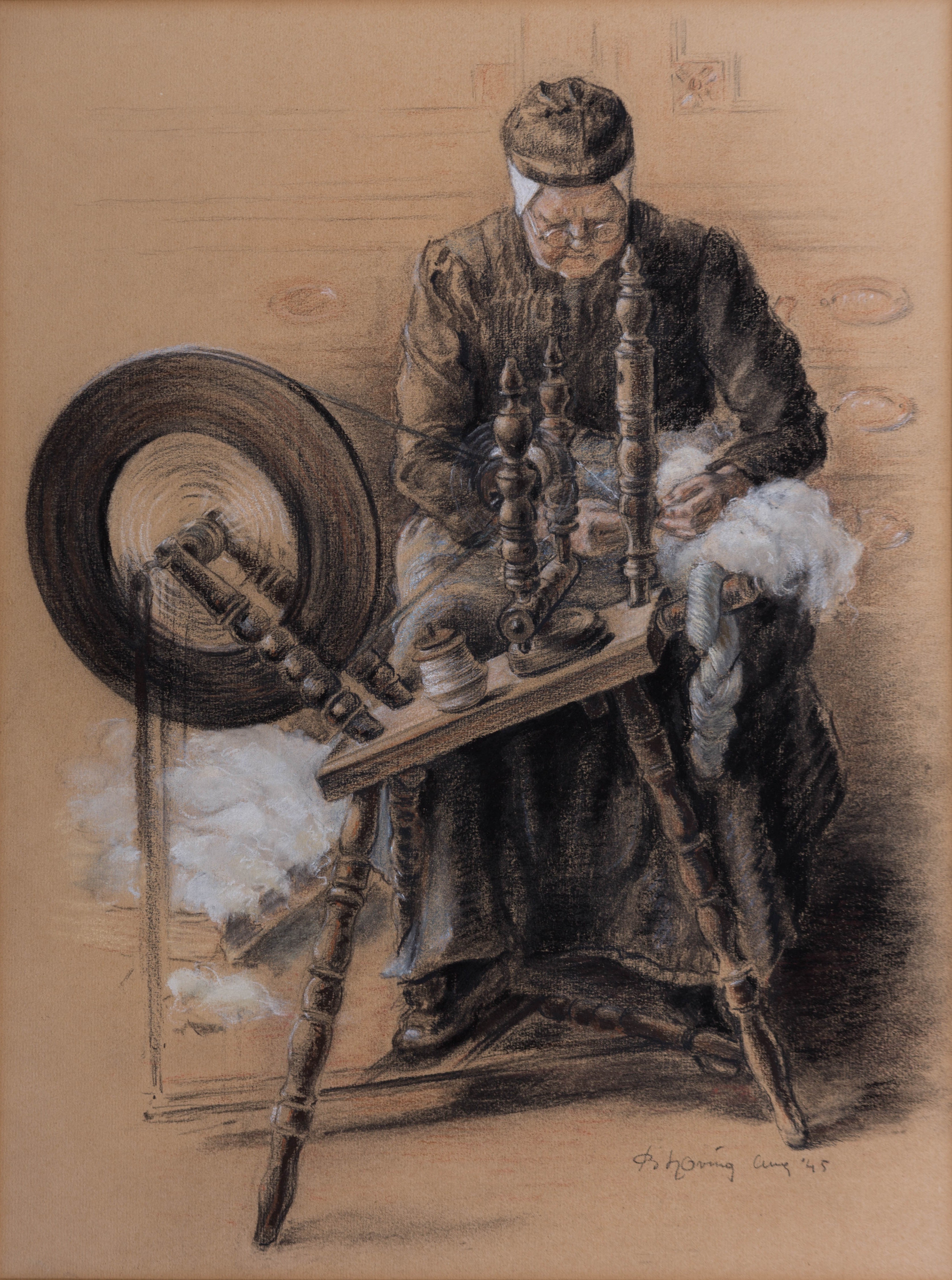 | opschrift | Achterkant: Berend Hoving (1901-1986) Griet Hoving-Zwaving aan spinnewiel. Pastelkrijt, 36 x 48,5 cm, 1945 |