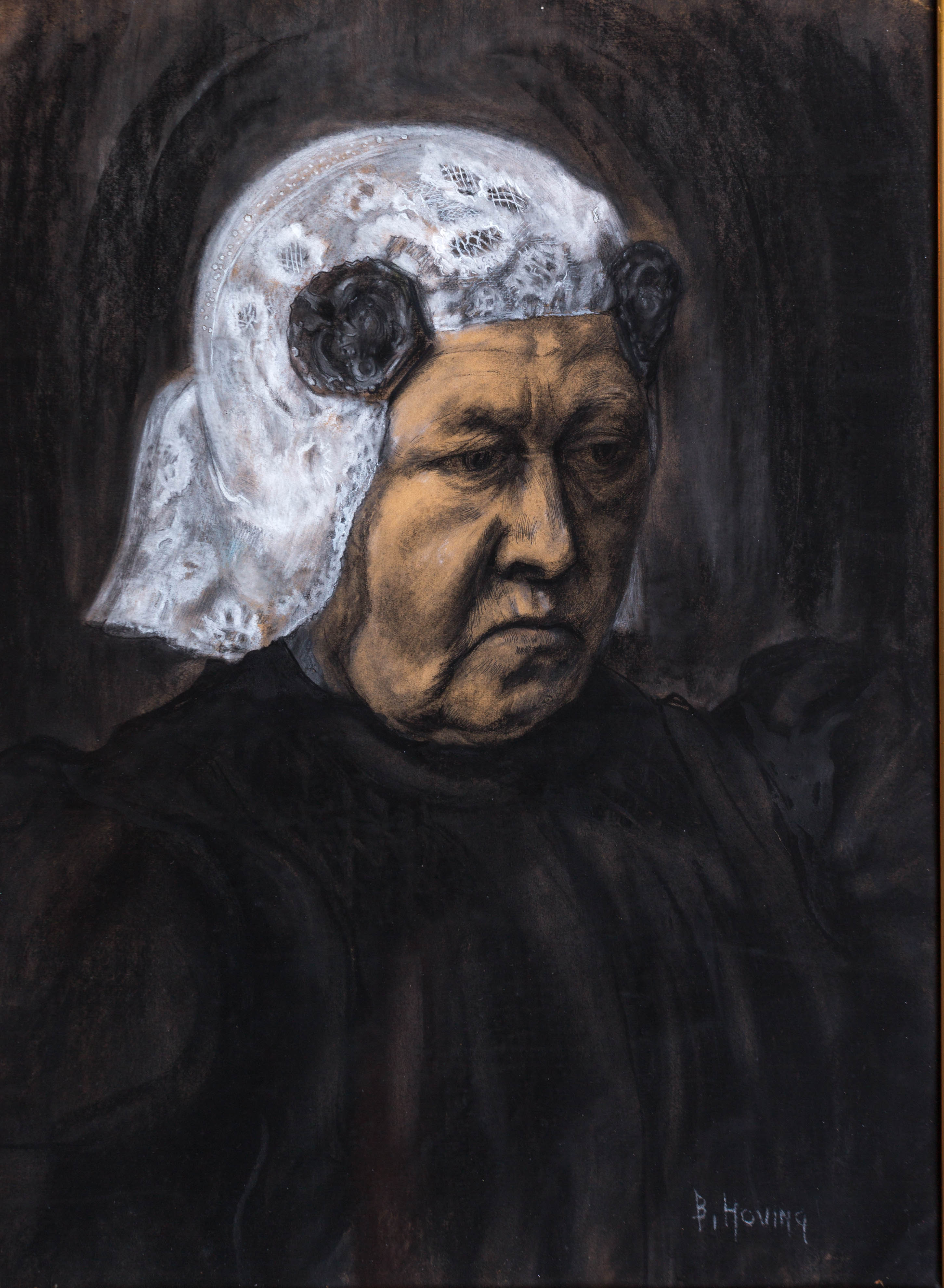 | opschrift | Achterkant: Berend Hoving (1901-1986), Griet Hoving-Zwaving met oorijzer, gouache, 35 x 49,5 |