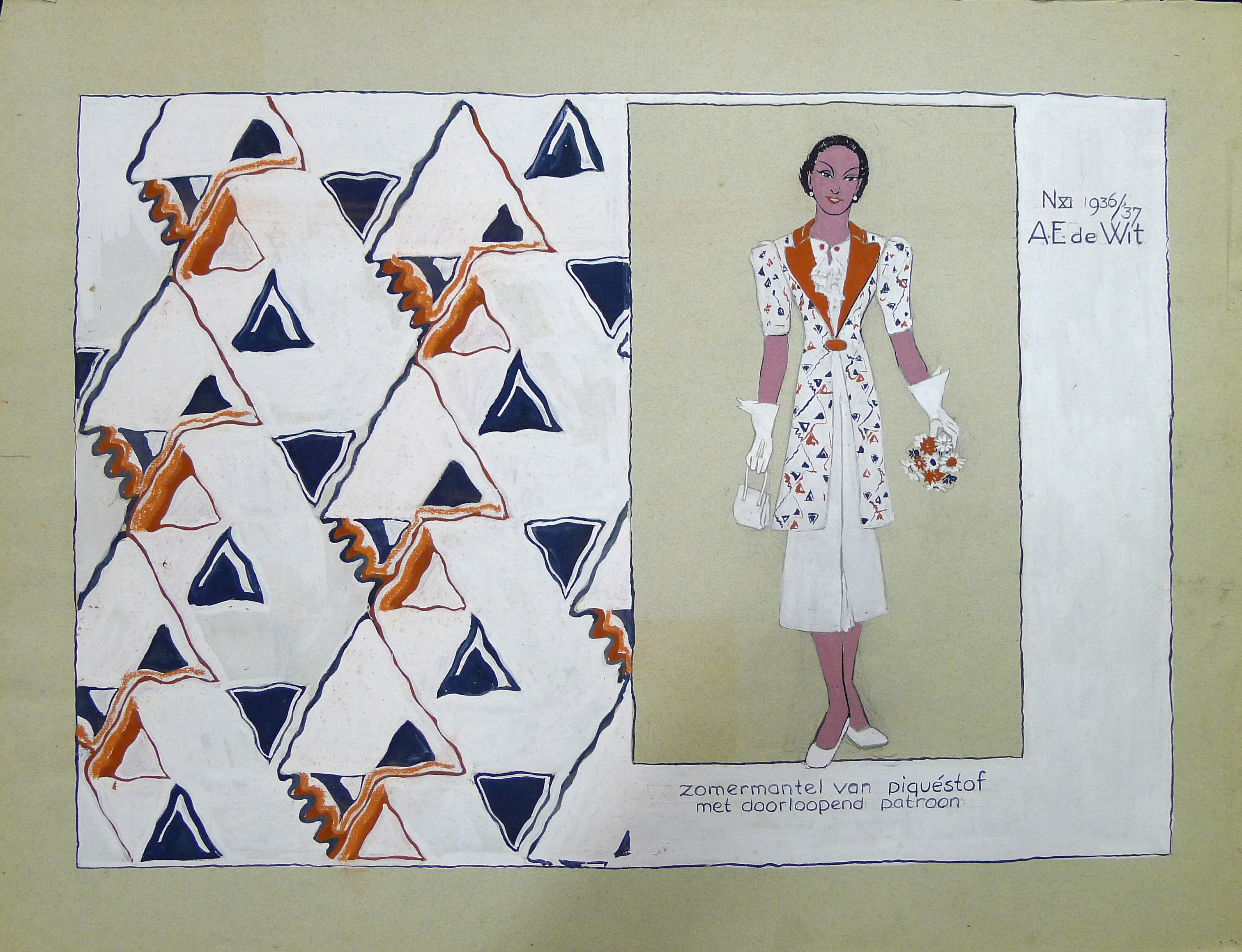| opschrift | rechtsonder zomermantel van piquéstof met doorlopend patroon rechtsboven N. XI 1936/37, A.E. de Wit |