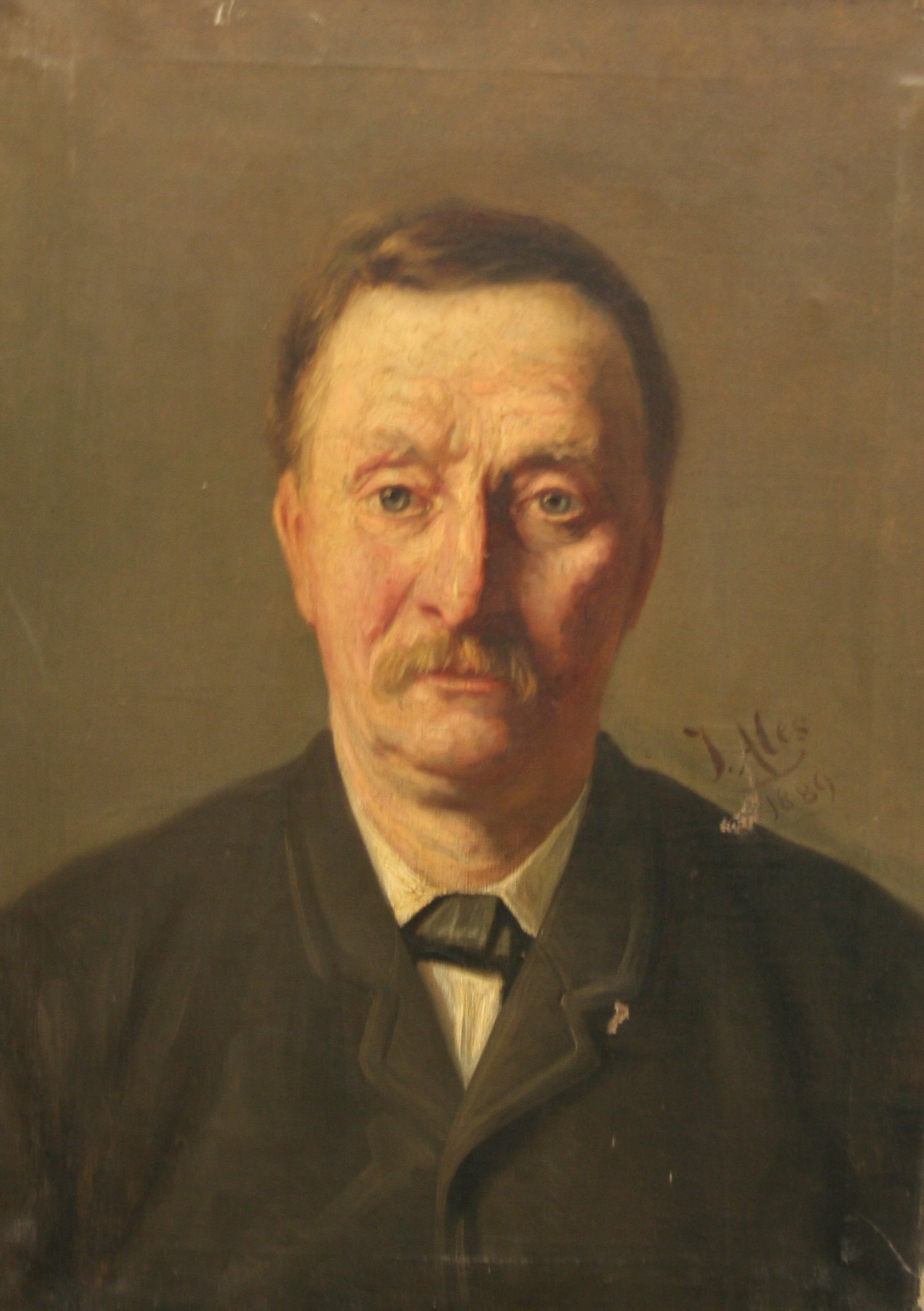 Portret en face van een oudere man met snor. Hij is gekleed in een nette donkerbruine jas en een wit overhemd. Door zijn kleding blijkt hij een welgestelde man te zijn. Hij heeft rossig haar en blauwe ogen. Zijn uitstraling is enigszins treurig.