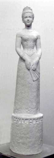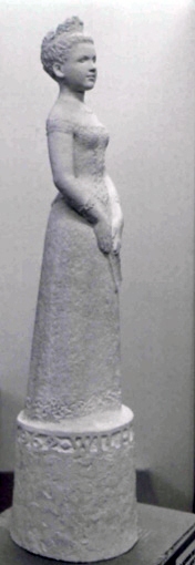 Op de tweede foto is zij gekleed in een hooggesloten japon en houdt met beide handen een geopende waaier op heup hoogte vast. In zijn ontwerp koos Wladimir natuurlijk voor de galajapon zonder de koningsmantel. De tweedelige galajapon bestaat uit een lijfje eindigende in een puntvorm in de taille, met een laag horizontaal decolleté en schouderbanden en uit een lange rok. De rok valt met een enkele plooi nagenoeg strak omlaag en reikt tot aan de sokkel. De nauwsluitende japon accentueert de elegantie van Wilhelmina, die er fier, maar toch ontspannen bij staat. In haar handen houdt zij losjes de halfgeopende waaier op heuphoogte vast. De versieringen van de japon en de sieraden zijn schematisch weergegeven. Het gezicht, daarentegen, is fijnzinnig uitgewerkt. De conisch gevormde, enigszins taps toelopende sokkel versterkt de opgaande lijn van het beeld. In de sokkel is de tekst ‘Wilhelmina .1880 .1962’ aangebracht. De gegevens van het beeld zijn nader uitgewerkt in een bewaard gebleven offerte met o.a. een situatietekening. De bedoeling was dat het beeld in brons zou worden uitgevoerd, 270 cm hoog, met een rood granieten sokkel, 100 cm hoog. Het bleef echter bij het kleine gipsontwerp van 64 cm hoog.