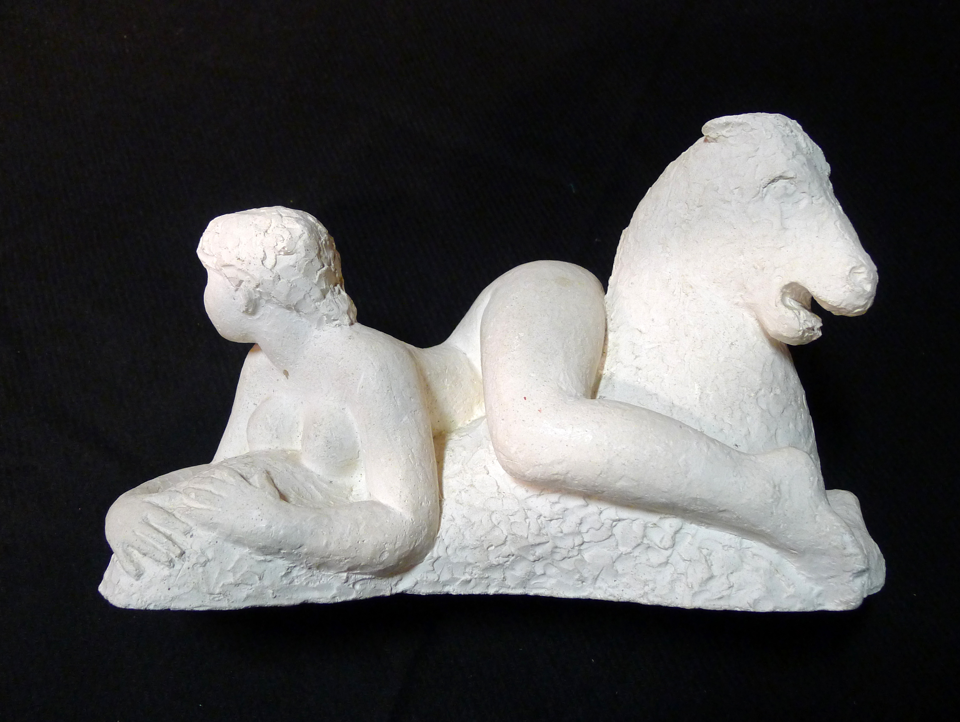 Liggend paard zonder benen met op de rug een naakte vrouw die achterstevoren ligt en haar benen om de hals van het paard geslagen.