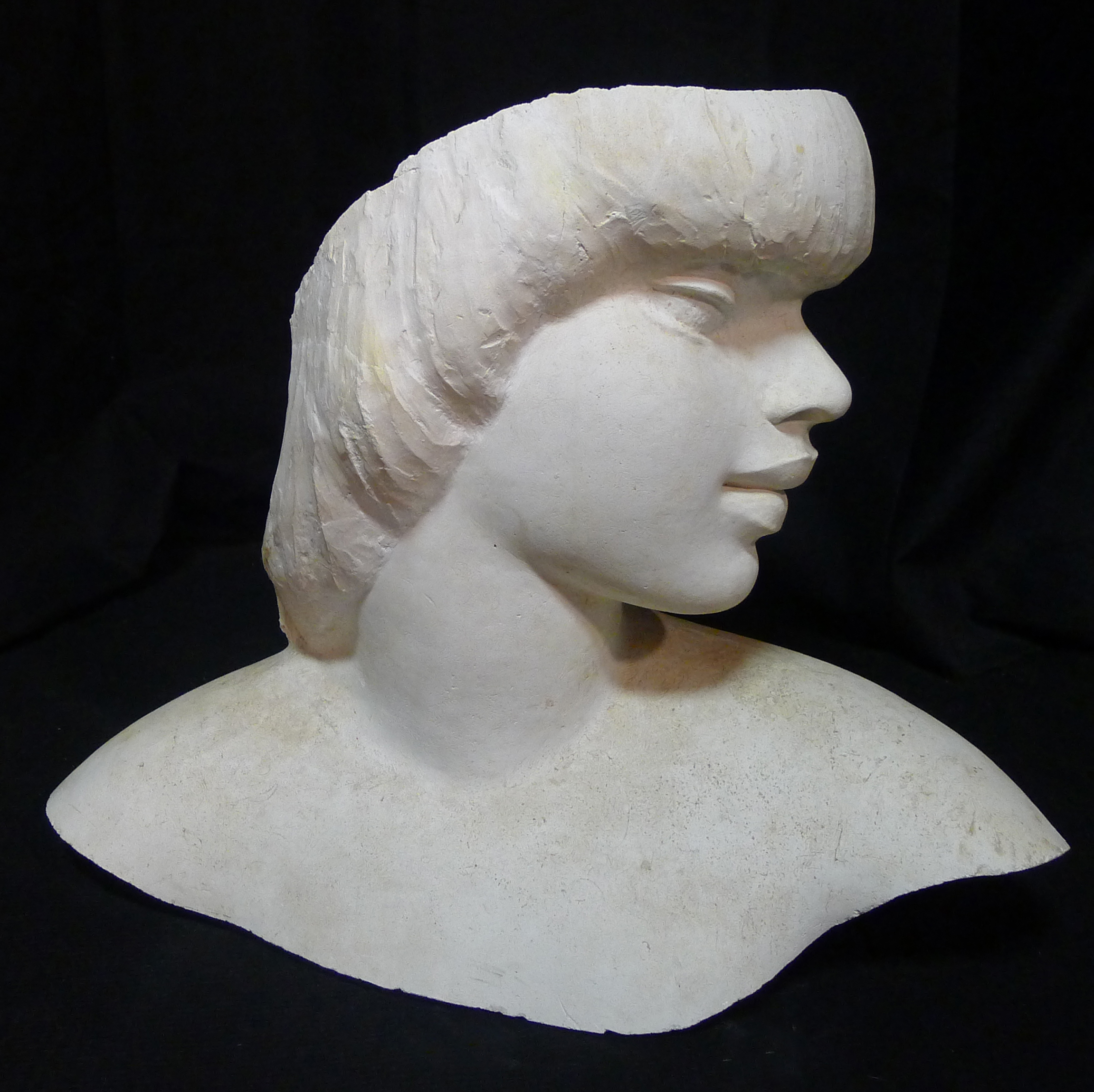 Deel van het oorspronkelijke beeld 'Arp Schnitger monument. Het beeld is de kop van een meisje, dat van boven open is.