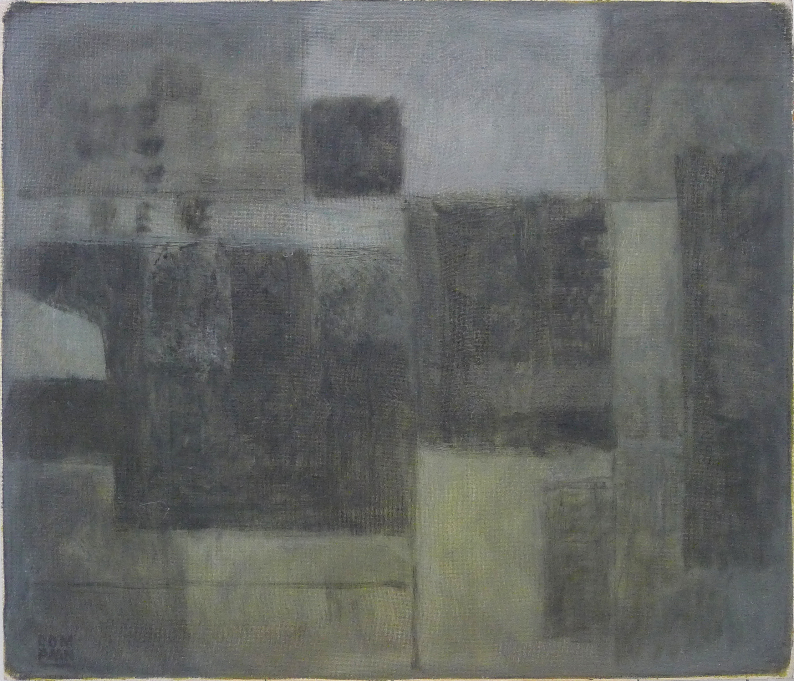 Abstracte compositie van vlakken in verschillende grijstinten. De vlakken zijn meest vierkant of rechthoekig en verschillen in grootte. De randen zijn niet duidelijk weergegeven, waardoor de verschillende vlakken in elkaar een beetje lijken over te lopen. De donkerste vlakken zijn in het midden van het kunstwerk.