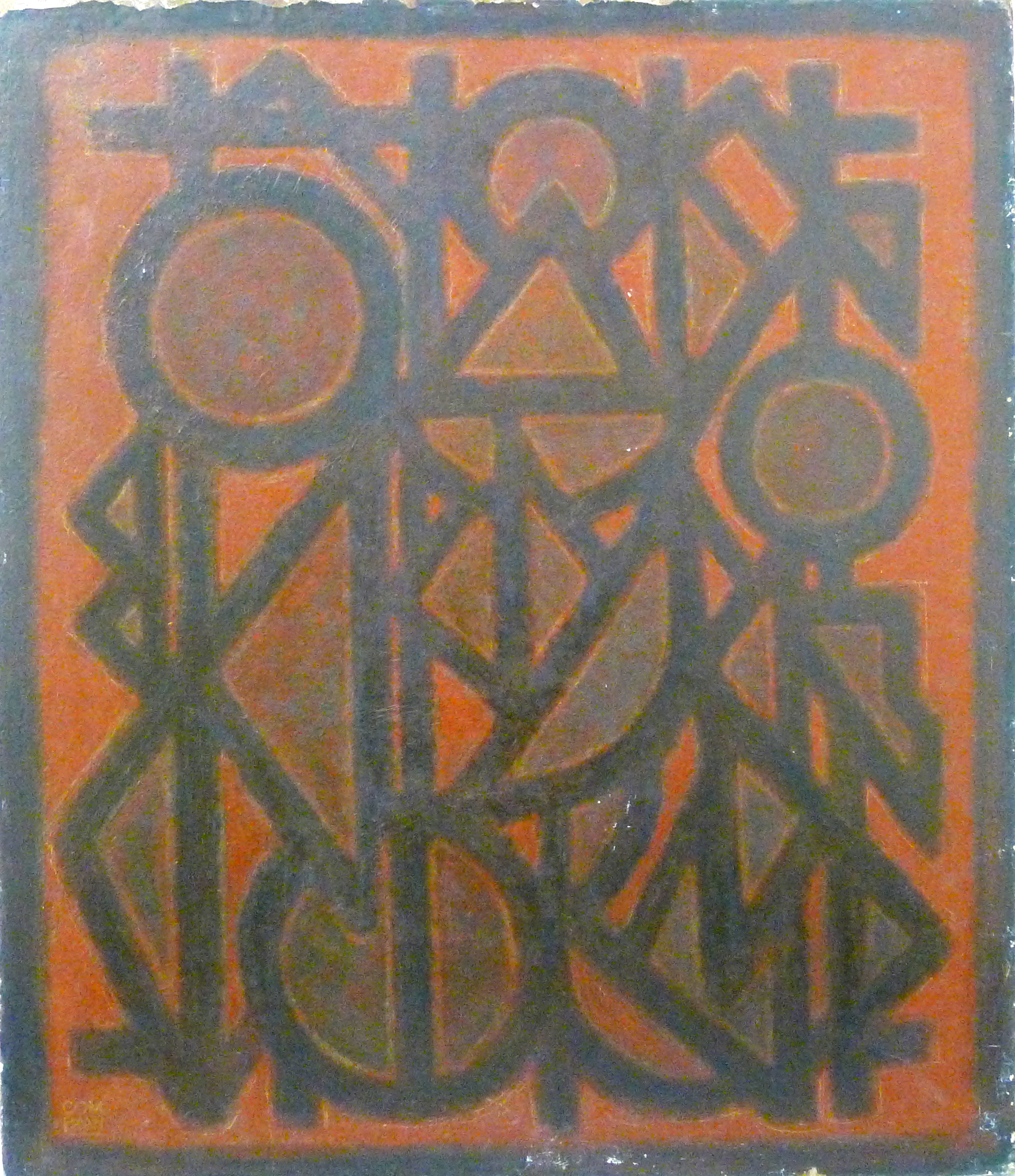 Abstracte compositie van allerlei geometrische figuren in rood. Het zijn vooral cirkels en driehoeken die elkaar deels overlappen en met elkaar zijn verbonden door met name verticale lijnen. Deze lijnen hebben dezelfde dikte als die van de geometrische figuren. De lijnen zijn donkerrood en contrasteren zeer met de felrode achtergrond. De geometrische figuren zijn roodpaars ingekleurd.