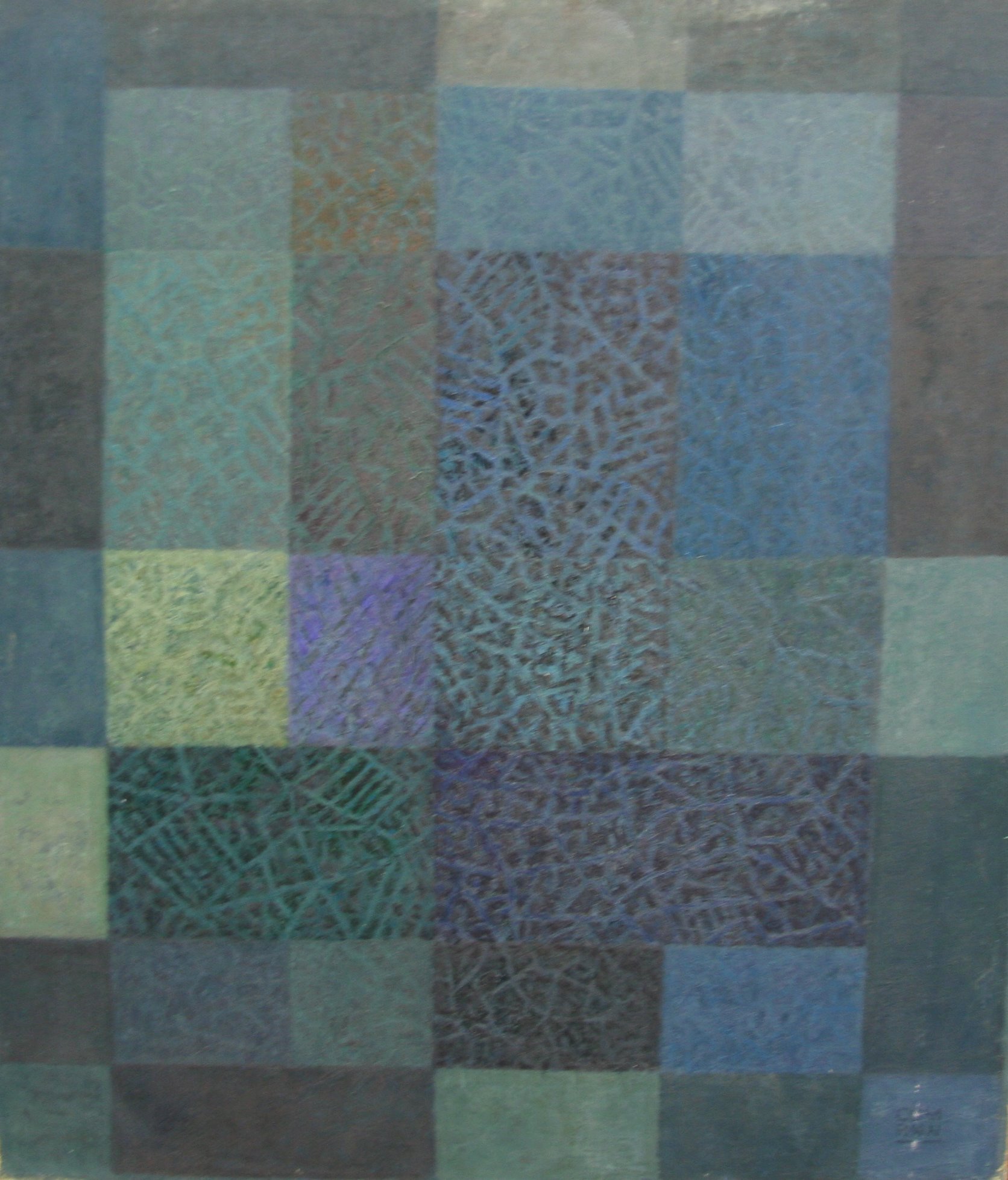 Abstracte compositie in verschillende tinten blauw en groen. Het gehele kunstwerk bevat rechthoeken en vierkanten van min of meer gelijke grootte. Vooral onderaan zijn de vlakken groen van kleur.